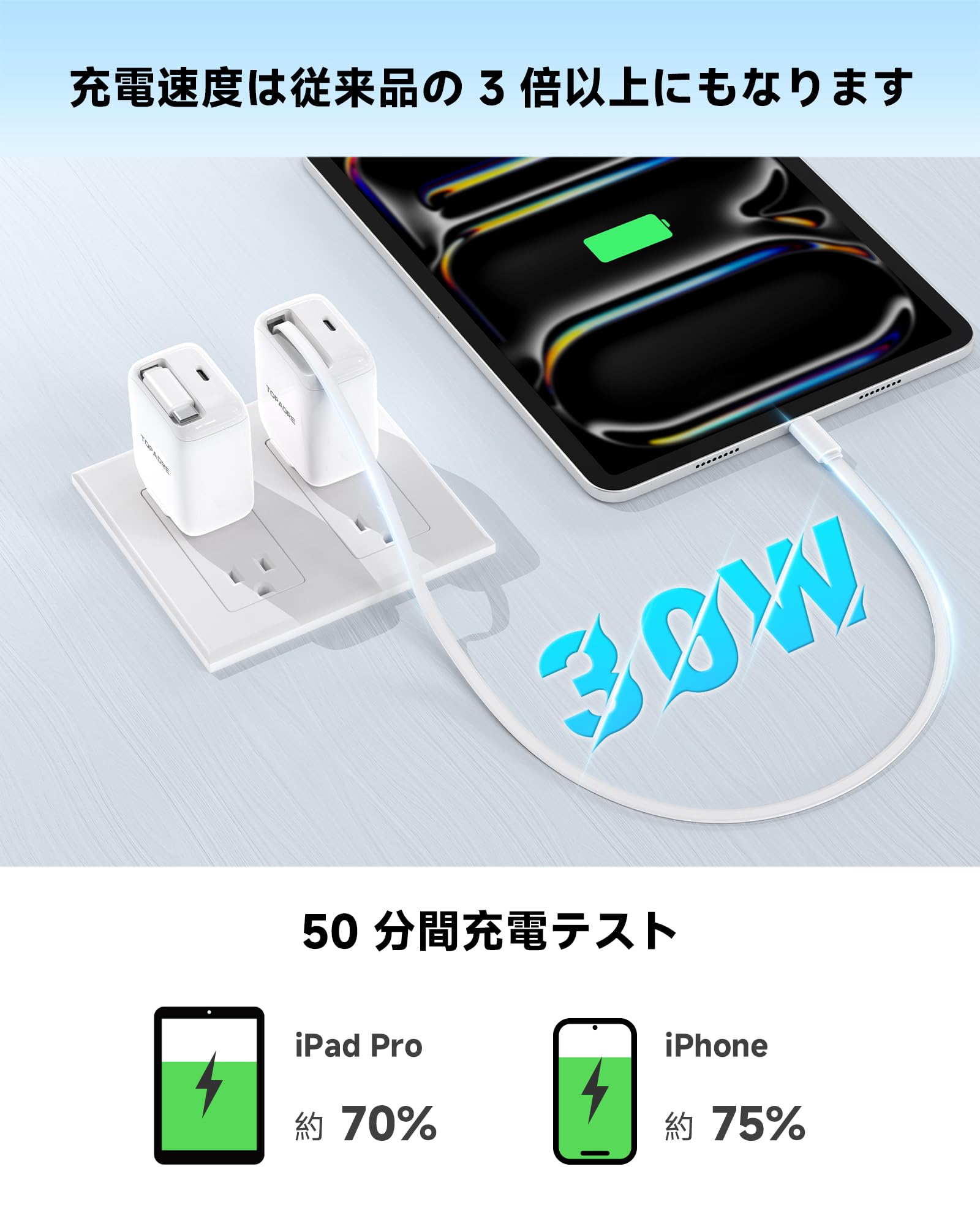 * 【当社最小の巻取り式充電器・折りたたみプラグ・超コンパクト】TOPADREはACアダプター専門メーカーです。当社最小のtype-c 2ポート 30W Type-C 充電器、70cmの伸縮式USB-Cケーブルを内蔵し(必要な長さに調節可能)+Type-Cポート。軽く引くだけで充電&収納でき、バッグ内で他の荷物と絡まる心配もありません。ケーブル内蔵でありながら、驚くほどコンパクトなサイズ(6.5×5.2×3.3cm)を実現。小型設計のため、コンセントの邪魔になりません。折りたたみプラグを採用しているので、ポケットにすっきり収まり、持ち運びに便利です。超小型・超携帯性の充電器を求めるあなたへ。仕様説明:複数デバイスを同時接続中に新たなデバイスを接続/抜去すると、充電器のスマート保護システムが作動し、電力配分を自動的に再設定します。この再設定プロセス中にポートの一時断電が発生することがありますが、充電は自動的に速やかに復旧します。これはお客様のデバイスを保護するための、マルチポート充電器における正常な動作プロセスです。