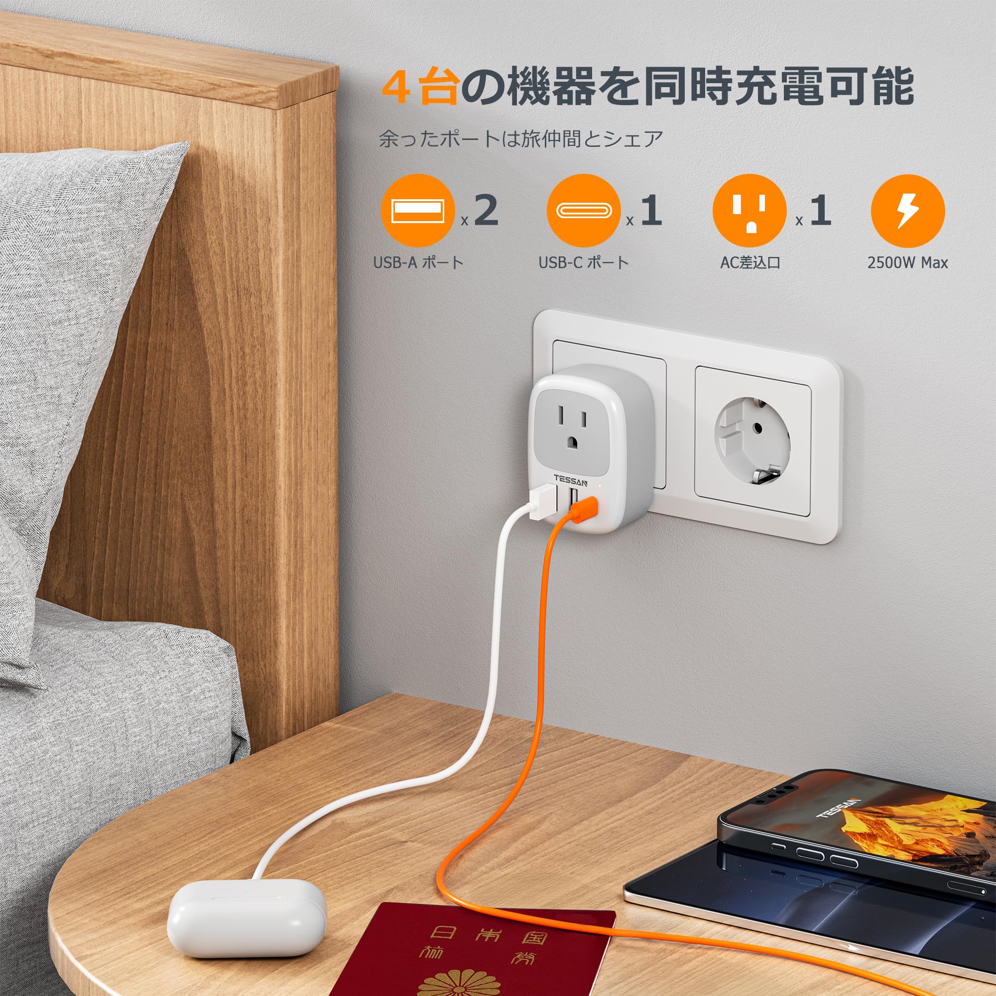 韓国 変換プラグ seタイプ TESSAN 海外 変換プラグ se コンセント 1個AC口 2USB-Aと1USB-Cポート 韓国 ドイツ フランス オランダ ハンガリー スペイン ヨーロッパなどへ海外旅行用便利グッズ