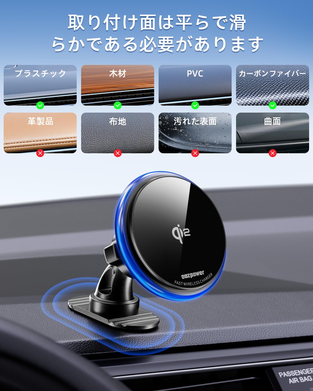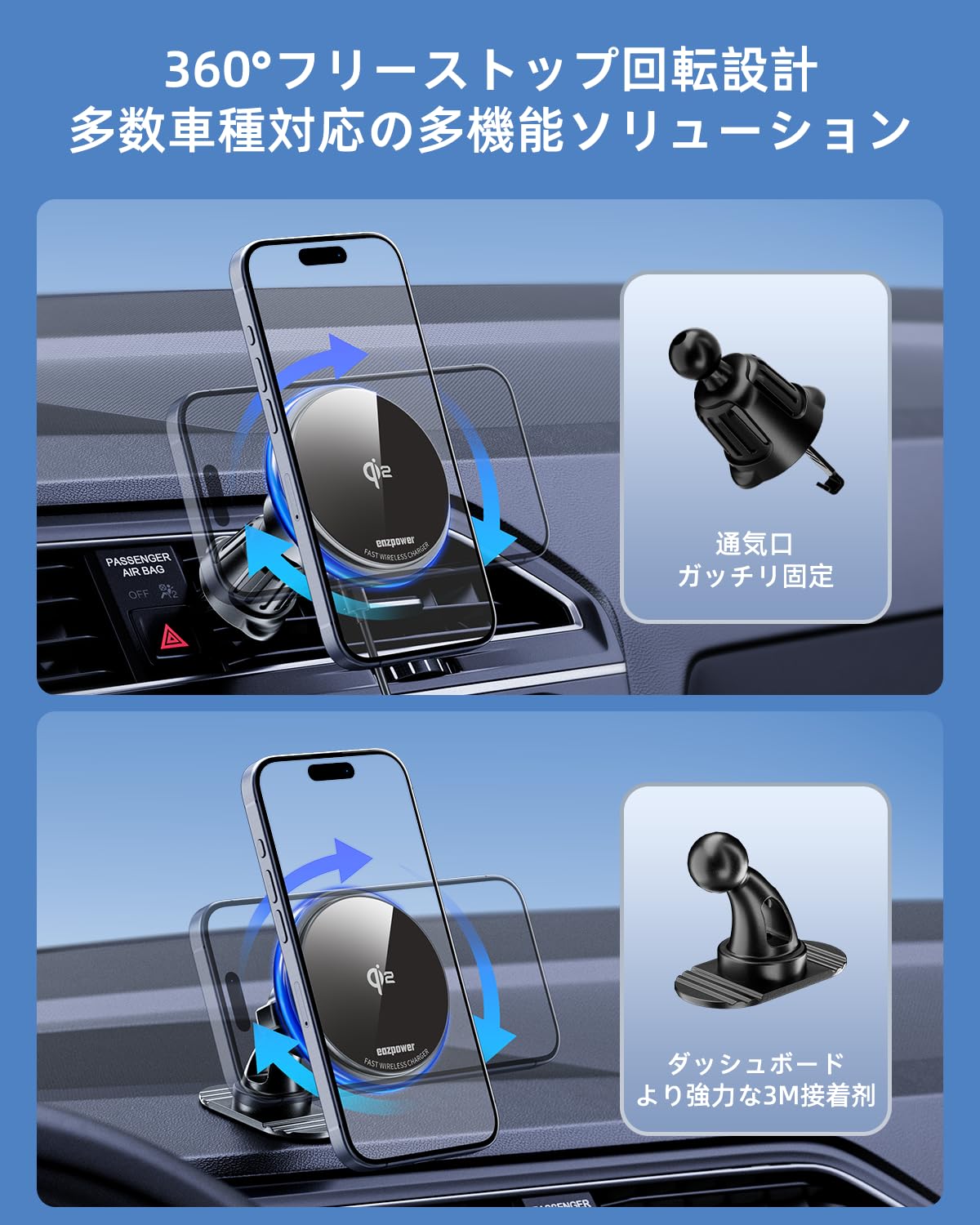 eazpower Qi2 Magsafe 車載ホルダー ワイヤレス充電 車 スマホスタンド 充電 まぐせいふ充電スタンド 車 スマホホルダー 車 充電 15W 急速充電 エアコンルーバー/ダッシュボード式 360度回転 カー用品 iPhone 17/16/15/14/13/12 シリーズ対応 iOS 26バージョンと多車種が対応 取付簡単 日本語説明書