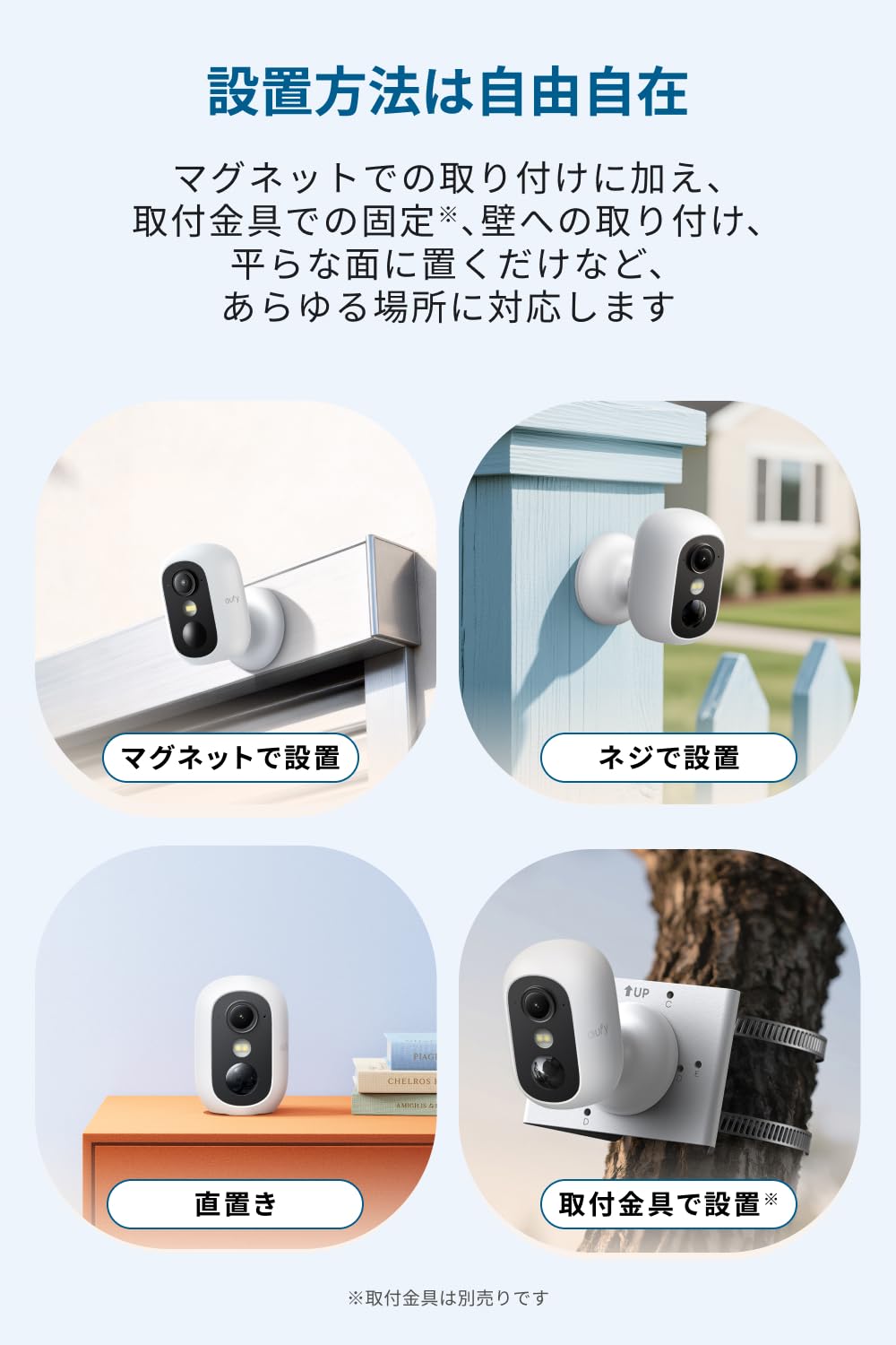 * 【マグネットで自由に取り付け】 : マグネットなら屋外・屋内問わずどんな場所でも簡単に設置でき、手軽に防犯対策ができます。取付金具での固定※、壁への取り付け、直置きなど様々な設置方法があります。 ※取付金具は別売りです
