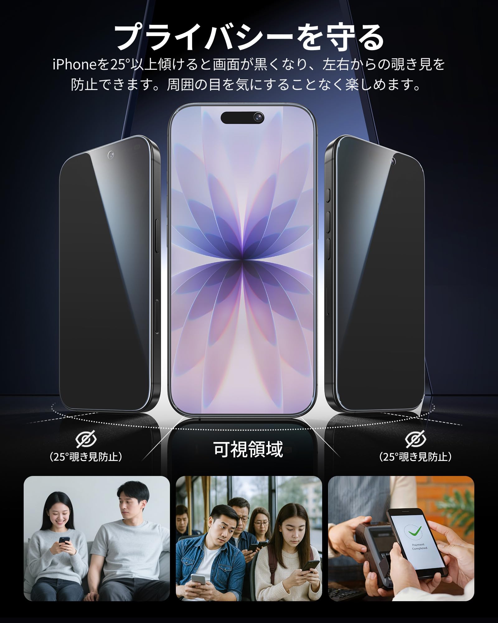 * 「25°覗き見防止」特別なブラインド加工により、iPhoneを左右に25°以上傾けると画面が黒く見えなくなるため、左右からの覗き見を防止できます。正面から見たときの透過率は高く、アイフォン17本来の液晶画面をお楽しみいただけます。Face IDの認証も問題ありません。あなたの大切なプライバシーをしっかり守ります。公共の場でも周りの目を気にせずにアイフォンをお楽しみいただけます。