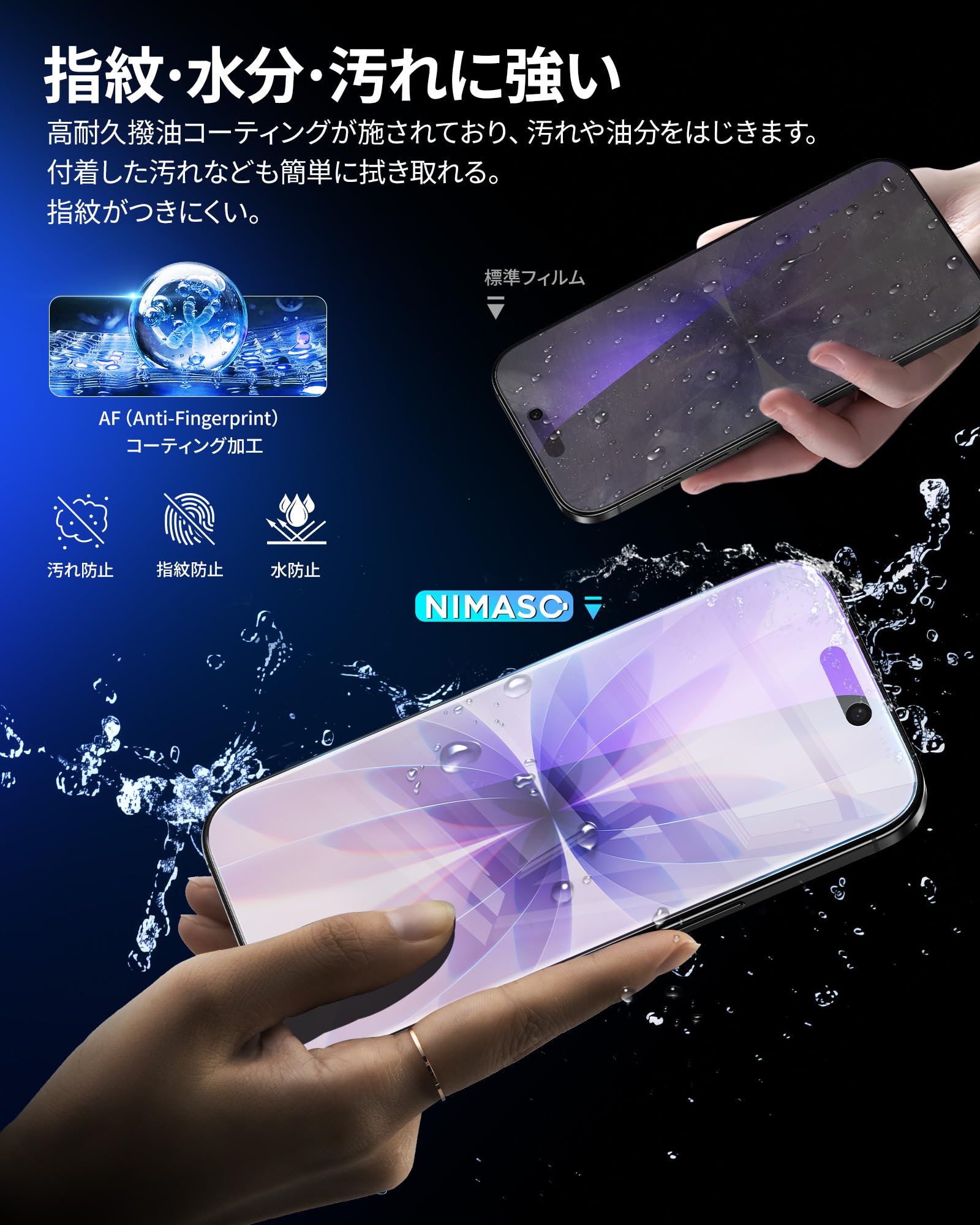 * 「指紋防止/汚れ防止・なめらかな手触り」本製品は撥水撥油のAF(Anti-Fingerprint)コーティング加工とスムーズタッチ加工により、指紋や汚れがつきにくく、油分や水分が強く付着した汚れも拭き取るだけで綺麗になります。また、使用時の手触りも滑らかで、動画視聴、仕事、勉強、ゲームなどのあらゆるシーンでも、常に美しいあいふぉん17の画面をお楽しみいただけます。