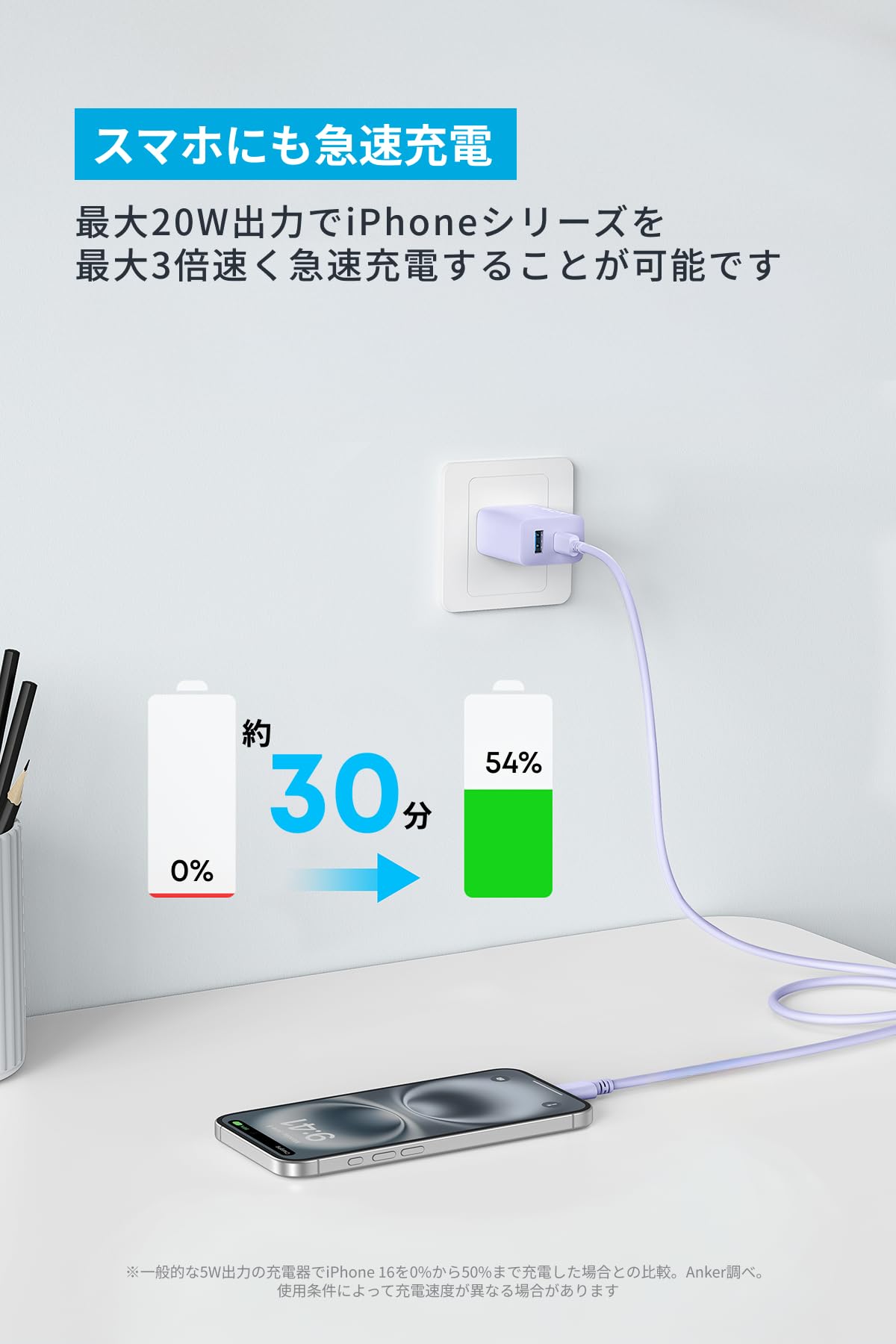 Anker Charger (20W, 2-Port) with USB-C & USB-C ケーブル パープル 2個セット