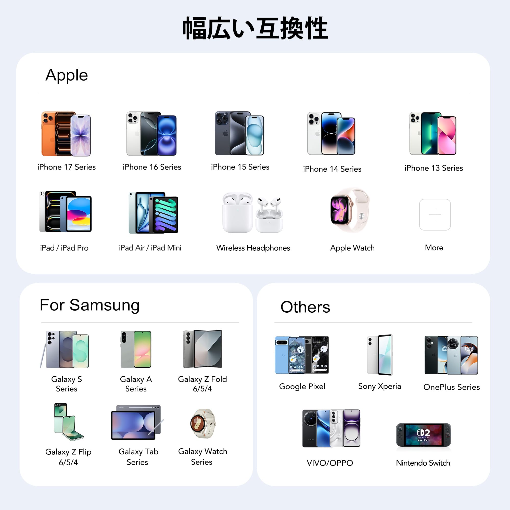 * 【ユニバーサル互換性】iPhone 16 15 14 13 12 11 Pro Max Mini Plus/ XS Max/ XS/ X/ XR/ 8 Plus/ 8、iPad Pro Air Mini、AirPods Pro、Samsung Galaxy S23/S23+/S23 Ultra/ S22/ S22+/ S22 Ultra/ S21/S21+/S21 Ultra/ S21+ 5G、S20/ S20 Ultra/ S20+/ S20 FE、Note 10/ Note 10 5G、Note 20/ 20 Ultra 5G/ S10 5G、Galaxy Z Fold 3 5g、A90 5G、A80、A70、Book S、Tab S7/S7+/S8/S8+/S8 Ultra、スイッチ、ファン、スピーカー、ランプなどに対応。