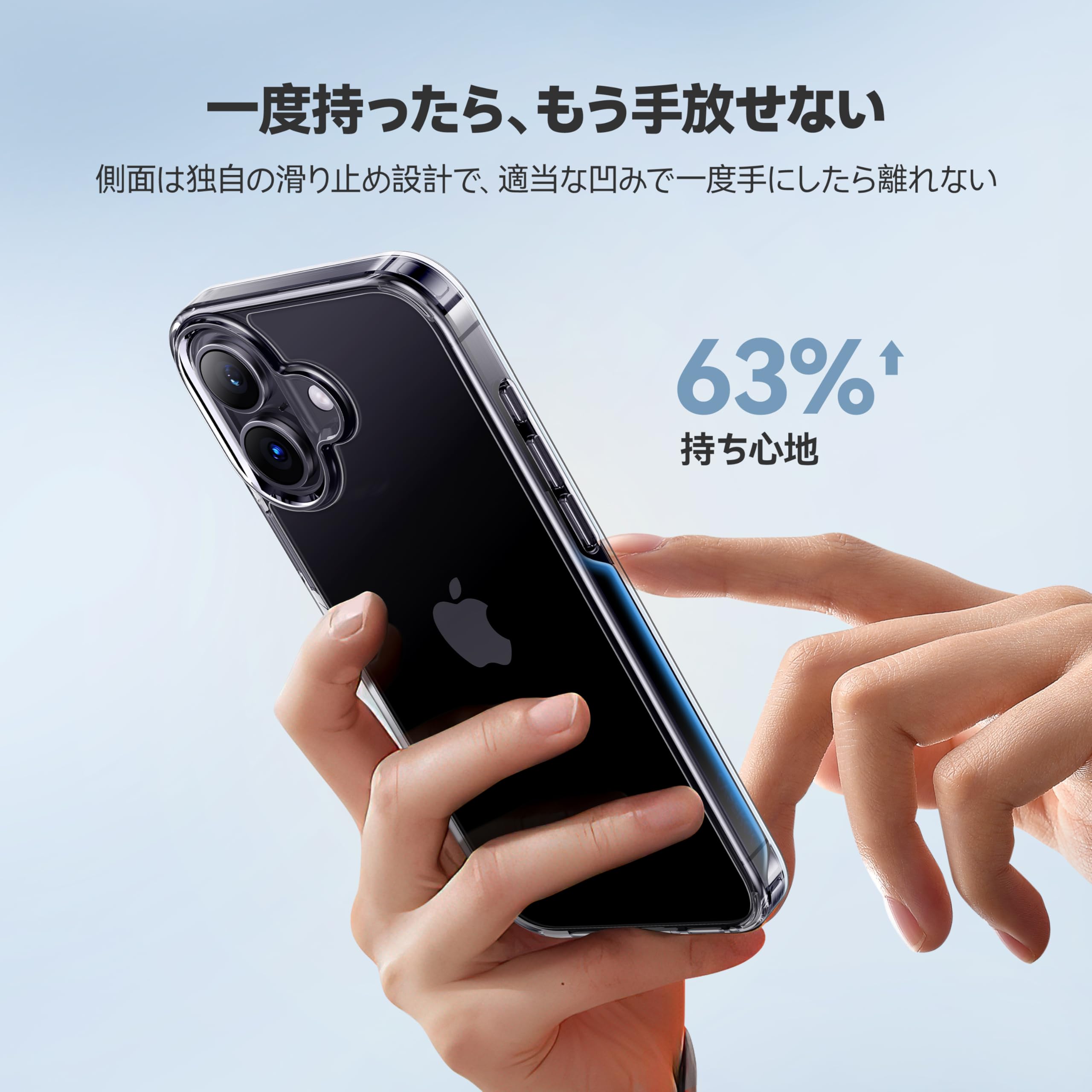 * 【すごく持ちやすさ・新感覚のフィット感】「窪んでいる方が持ちやすい」という発想から、人間工学に基づいて両側に適度な凹みを設計し、掌にぴったりフィット。高透明度ポリカーボネートとドイツ製TPU素材を使用し、装着・脱着も簡単。滑りにくさが5倍向上し、持ち心地が従来品より63%改善。手にしっかり馴染み、滑り落ちる心配もありません。対応機種:iphone17ケース