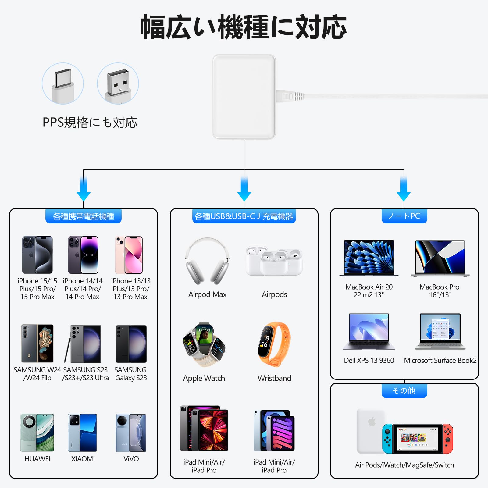 * 【スマートIC搭載・電流を自動判別】接続機器に応じて最適な出力を自動調整するスマートIC搭載。機器に過剰な負荷をかけず、安全かつ効率よく充電可能。全ポート使用時も安定した電力分配を実現。