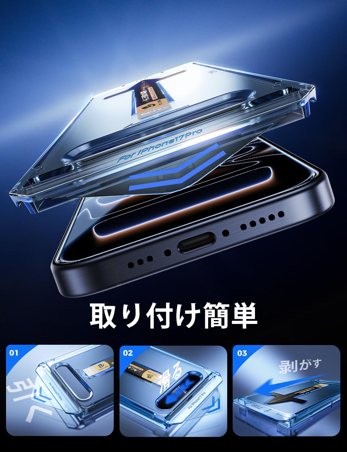 * 【もう失敗はしない】本製品は対応 iPhone 17 Pro に対応するガラスフィルム2枚セットです。百万以上の欧米ユーザーのフィドバックを集めて日々改善したガイド枠は、3歩だけで保護フィルムを貼り付けます。そのうえ、自動ホコリ取りデザインだけでなく、ガイド枠のスロープデザインで、空気を順序に取り除くことができて、初心者でも気泡レスのまま綺麗に貼れます。