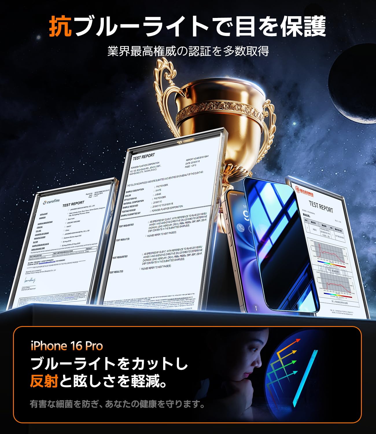 * 【超クリアなロスレス画質&健康を全面的に守る】このiphone用の 16 Proフィルムは、新しくアップグレードされた高透過率素材を採用し、高透光率、スマホ画面のオリジナルの高精細な画質を再現、超クリアな視覚体験を提供します。また、弊社のいphone16 Pro ガラスフィルムは、国際認証のブルーライト防止テストと抗菌テストをクリアしています。ガラスフィルム表面のAnti-Reflective/Anti-Blue Lightコーティングにより、ブルーライトをカットし、長時間や夜間にスマホを使用する際、ブルーライトが視網膜に与える潜在的なダメージを防ぎます。 目を大切に!さらに、最新のナノ抗菌技術を採用し、表面に付着する99.9%の細菌を強力に抑制します。お子様も安心して触れることができ、あなたとご家族の健康を全面的に守ります