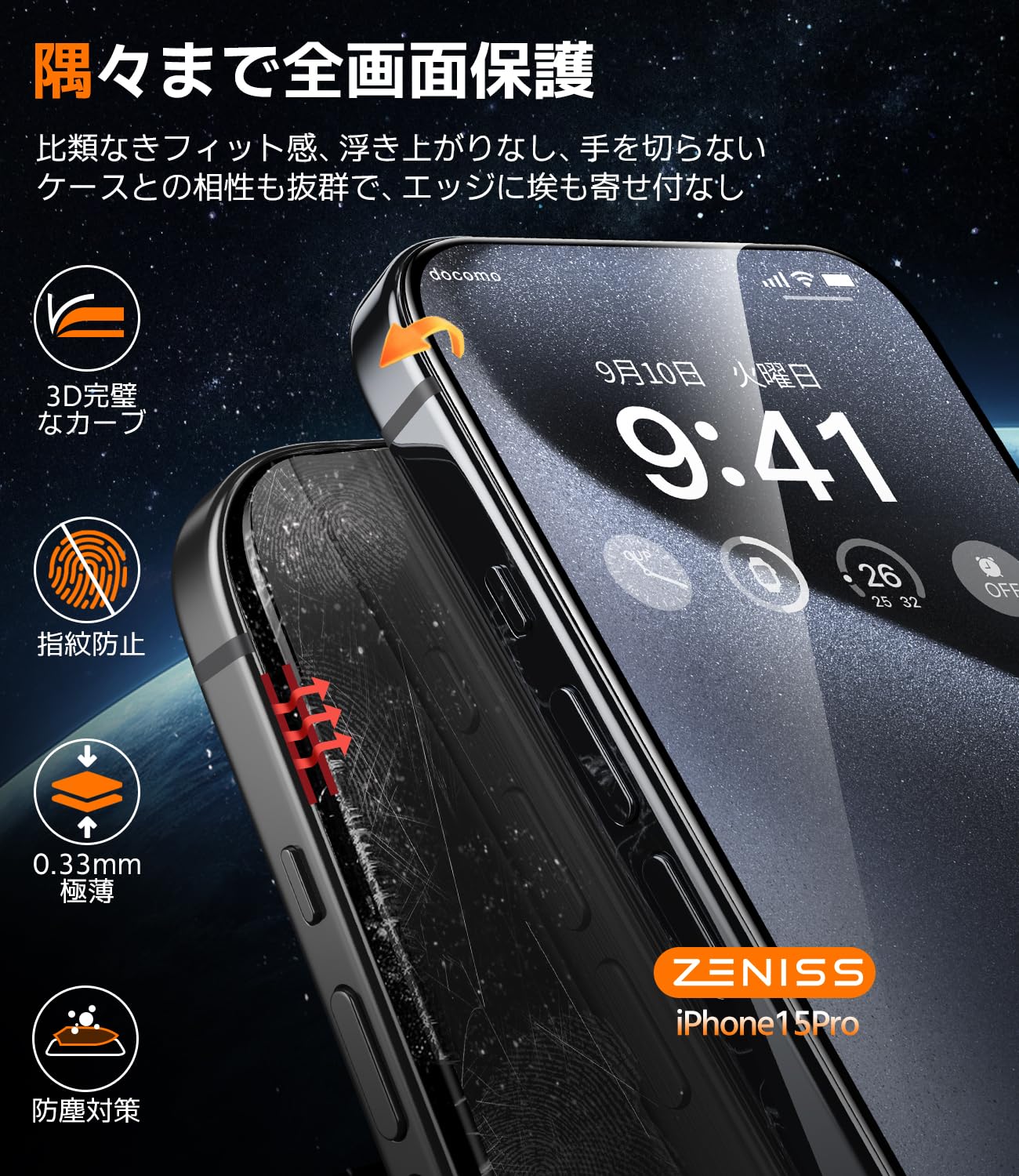 Zeniss iphone用の 15 pro ガラスフィルムに適合する 【米軍規格航空材料&革新的なガイド枠】2枚セット いphone 15proフィルム 耐衝撃·硬度10H 全面保護 気泡レス 自動吸着 貼りやすい ガラスフィルム 超鮮明な画質 高光沢 スマホフィルム ブルーライトカット 目に優しい 保護フィルム 指紋防止 飛散防止 スクラッチ防止 強化ガラス 極細黒縁あり 6.1インチ