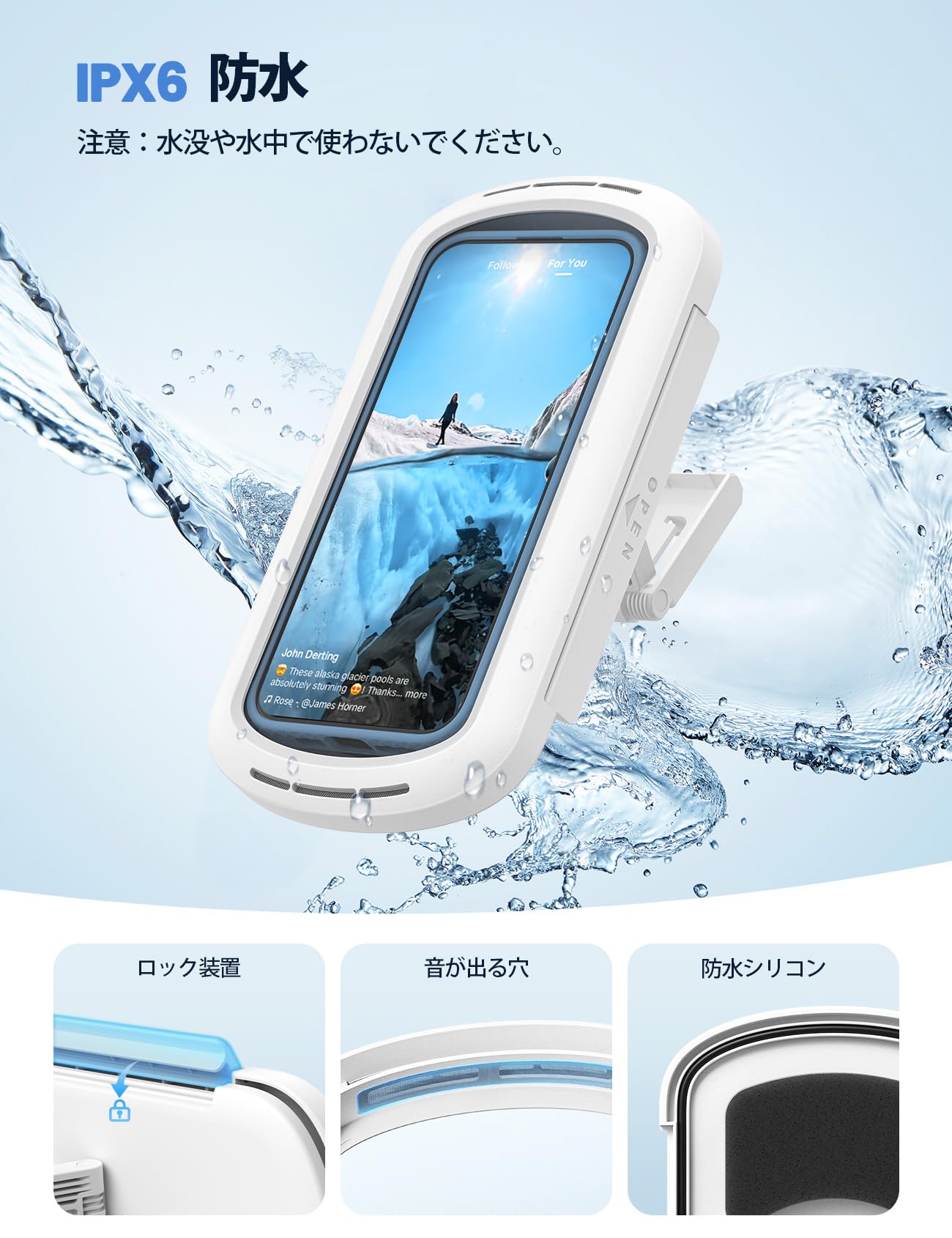 * 【IPX6防水・落下防止】防水国際保護等級IPX6に準拠しており、全方向からの強い暴噴水に対応。表面には防水コーティングを施し、水の侵入を徹底的に防ぐよう二層防水構造を採用しました。ケース内にも密着防水シリコンが取り付けられています。入れる口の改良したロック装置で、気密性の高い状態をキープでき、保護性能に優れています。蓋の60℃固定角度で、スマホの入れるのも便利し、意外にケースを開けてスマホが落とすのも防止できます。スポンジが三箇所あり、大切なスマホを傷からちゃんと守ります。注意:本製品は完全防水ではありません。水中に沈めるといった使用は控えてください。曇るのを防ぐため、水温が50℃以上の水でのご利用を避けてください。