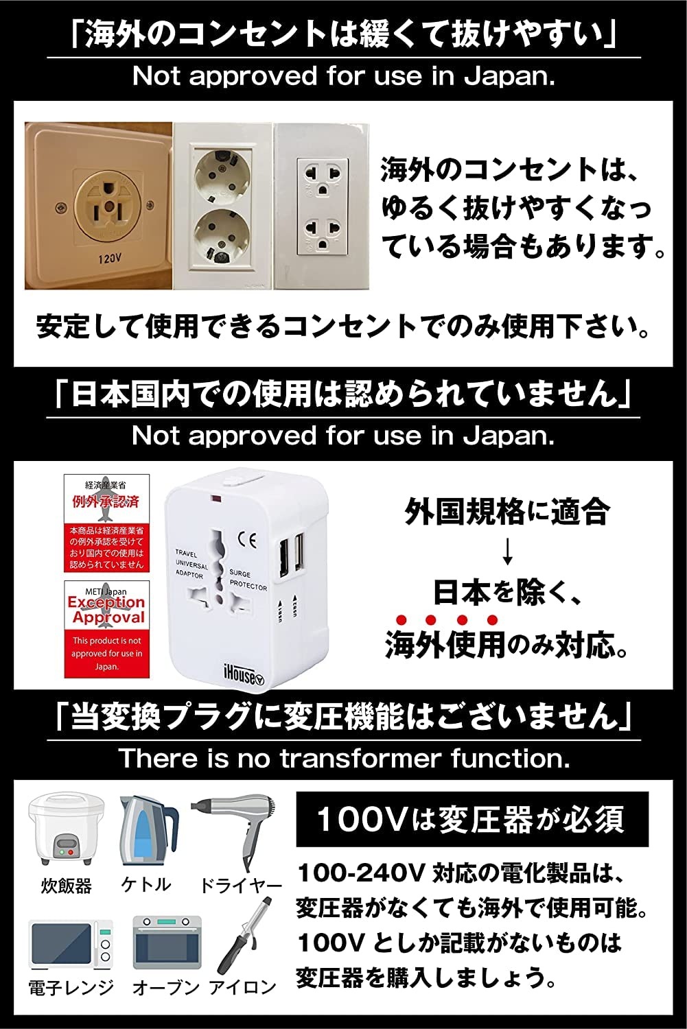 * 本製品に変圧機能はございませんので、ご使用の際は必ず電圧をご確認ください。100-240V対応と表記の電化製品は海外仕様電化製品のため、変圧器がなくても使用可能です。100Vとしか記載がないものは日本国内国内仕様のものの為、別途変圧器をご用意ください。また、炊飯器、ヘアドライヤーなどの高出力電化製品は変圧器と併用してご使用いただく必要があります。