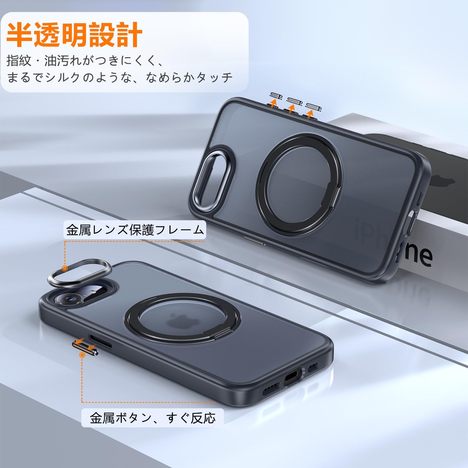 * 「マット仕上げ・汚れに強い」:背面は半透明のマット加工を施した、指紋や油汚れが付きにくく、iPhone16e の本体をさらさらとした質感で手に馴染みます。シンプルながらも上質な雰囲気を演出し、落ち着いたデザインに仕上げました。※ストラップホール付き。
