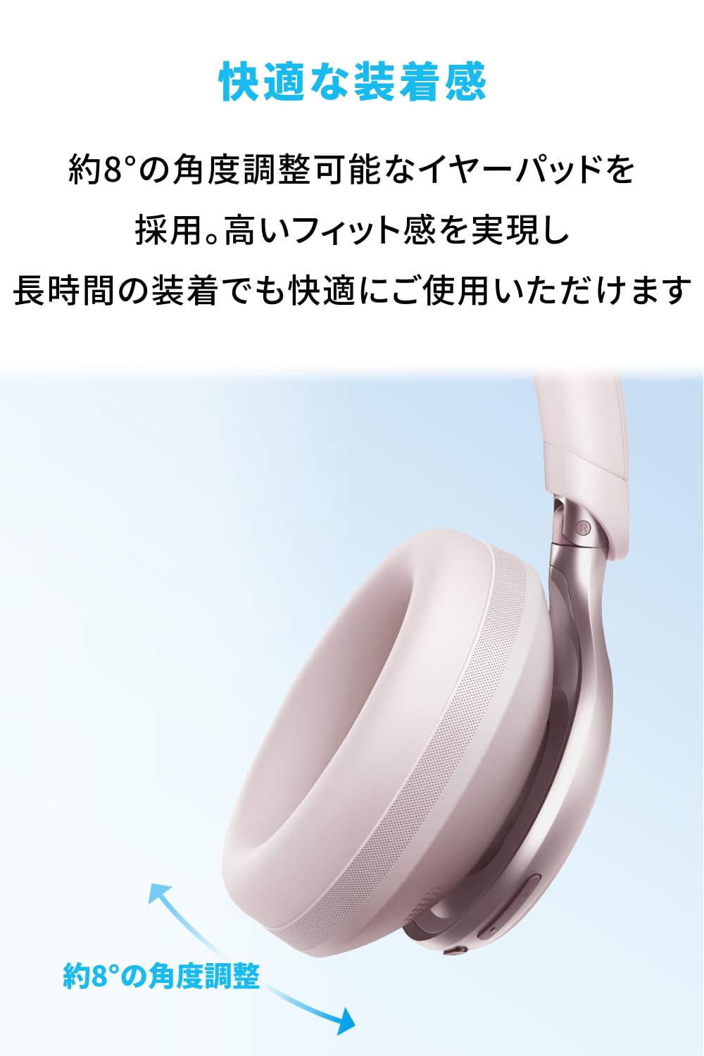 * 快適なフィット感: 約8°の角度調整が可能なイヤーパッドとクッション性の高いヘッドバンドを採用。頭の形に合わせた高いフィット感を実現し、長時間の装着でも快適にご使用いただけます。