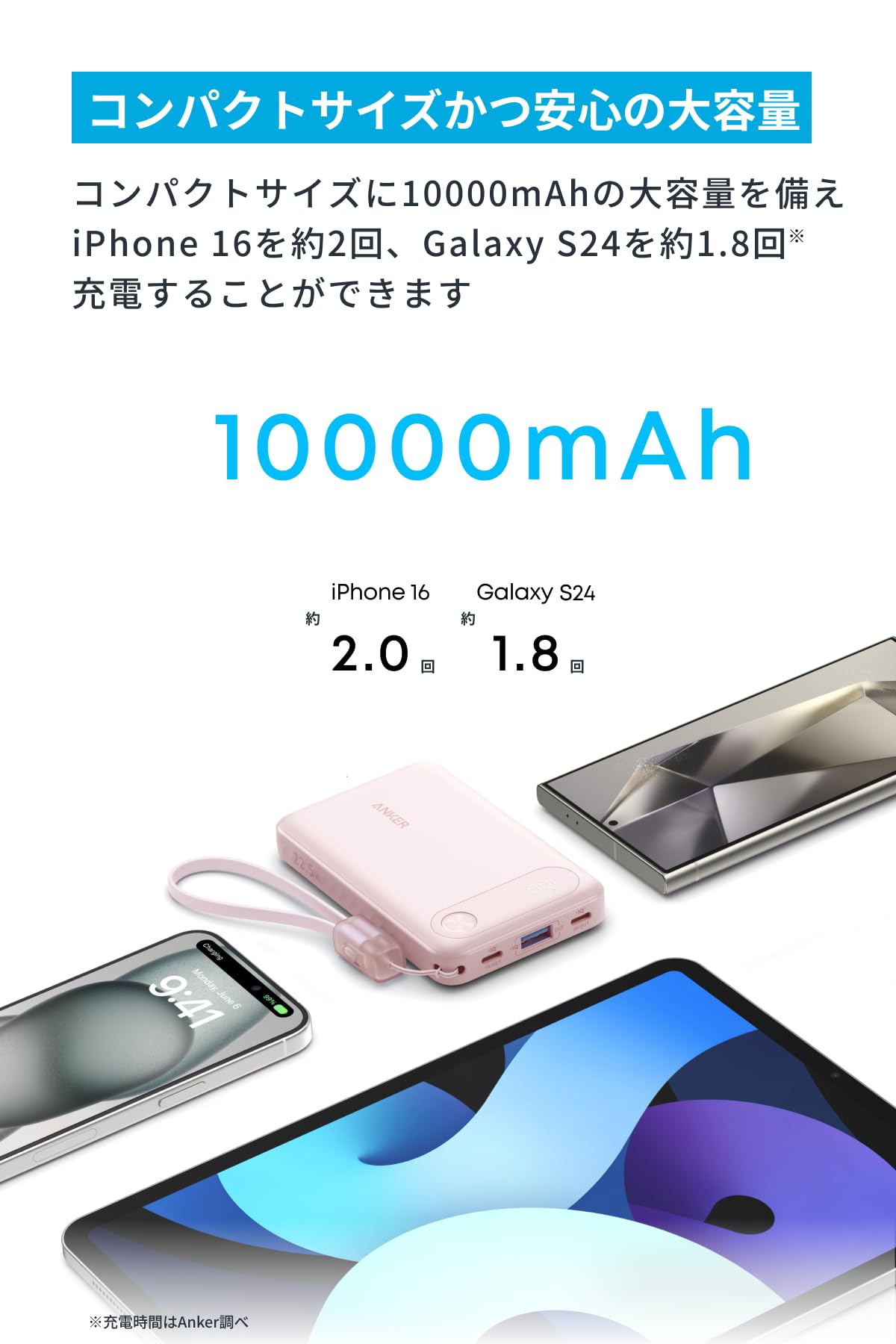 * コンパクトサイズかつ安心の大容量:コンパクトサイズながら10000mAhの大容量で、iPhone 16を約2回、Galaxy S24を約1.8回充電することができます。