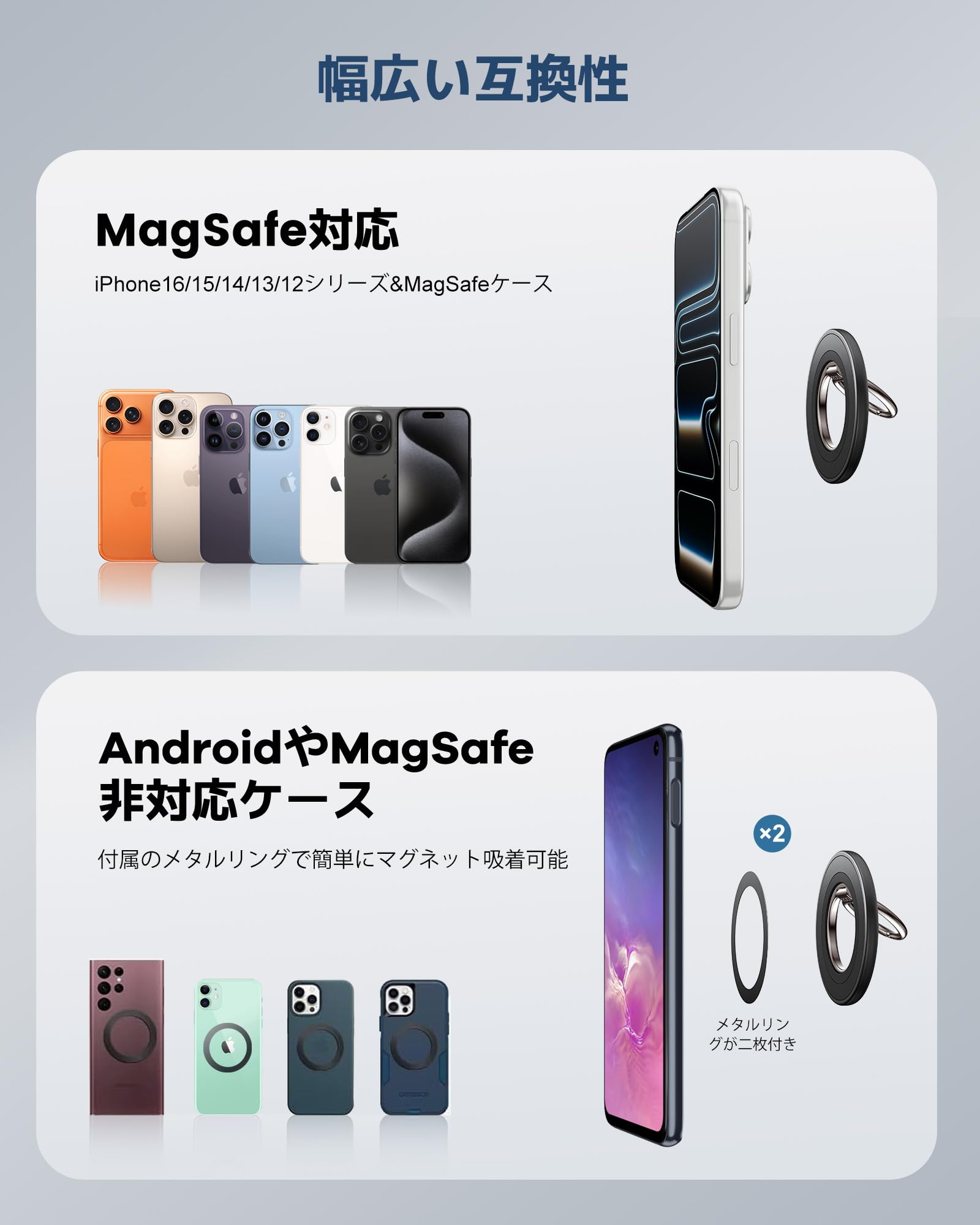 * 【対応機種】iPhone Air,iPhone17、17Pro、17Pro Max,iPhone 16、16Plus、16Pro、16Pro Max, iPhone 15、15Plus、15Pro、15Pro Max, iPhone 14、 14pro、 14pro max、14Plus, iPhone 13、13 Pro、 13 Pro Max、13 mini, iphone 12、 12 Pro、12 Pro Max、12 miniやMagSafe搭載ケースに直接装着可能です。付属されたメタルリングを利用すると、磁力がもっと強くなります。iPhone 11/iPhone X /iPhone 8/ SEまたはSony Xperia、SHARP AQUOS、Samsung GalaxyなどMagSafe機能帯びないスマホとケースは付属のメタルリングを貼れば簡単に使用することもできます。