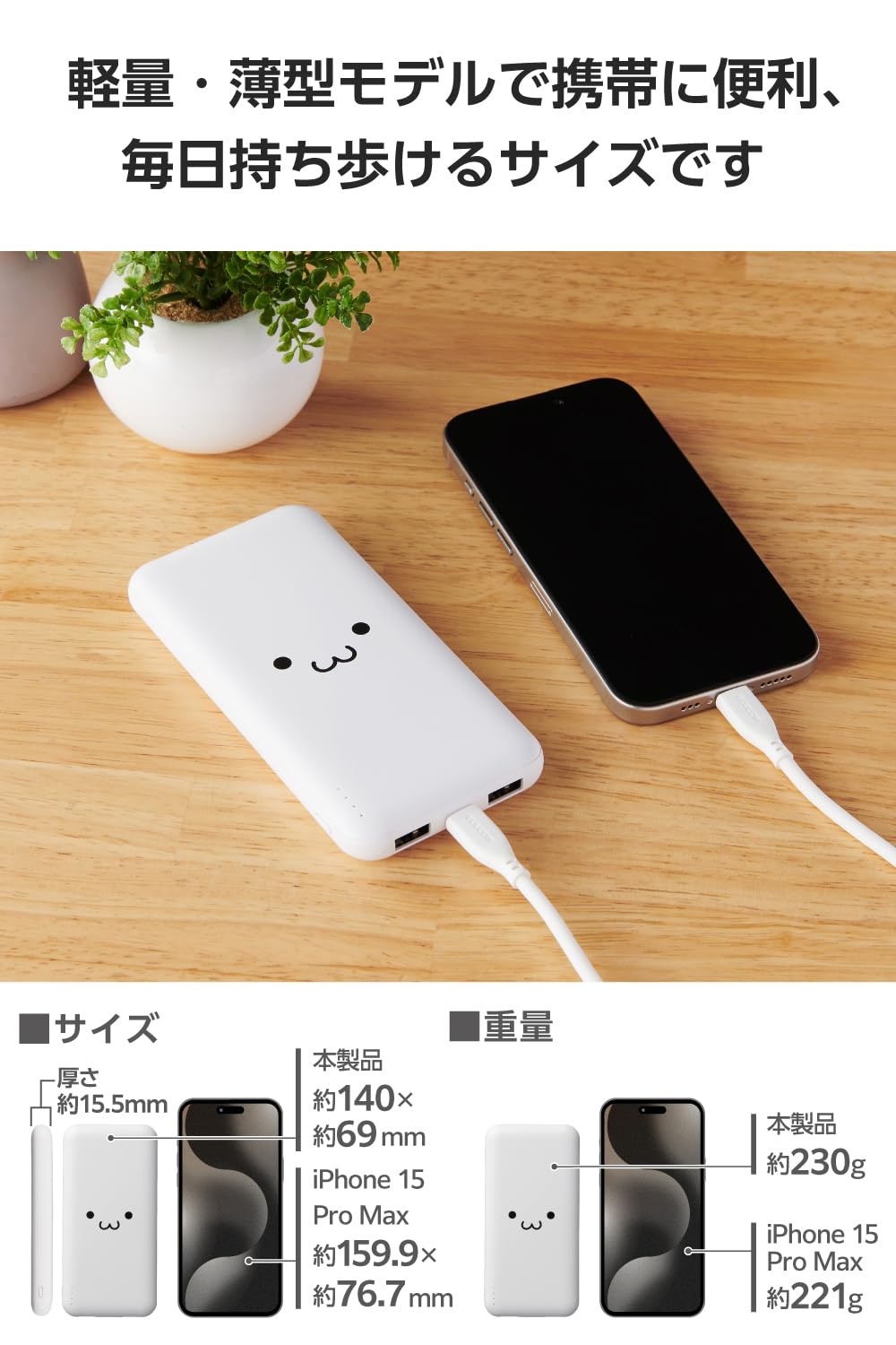 * たっぷり使える10000mAhで長時間の外出時も安心。持ち運びしやすい薄型形状のモバイルバッテリーです。