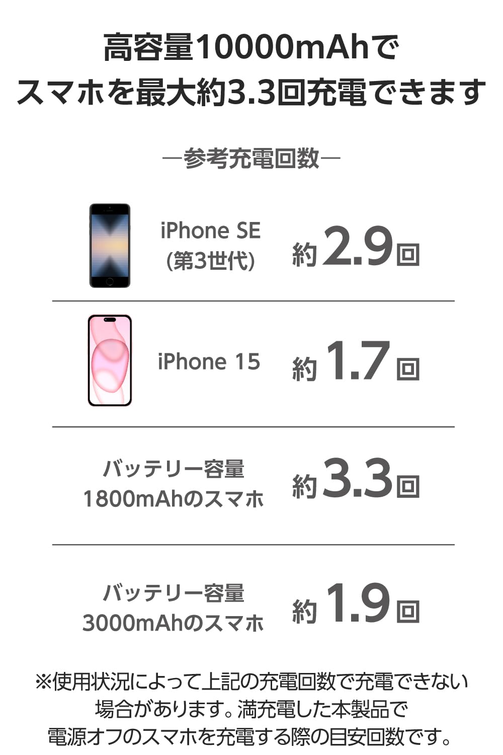 * ※満充電した本製品で電源オフの状態のスマートフォンを充電する際の目安回数です。充電中に電源を入れたり、機器を使用したりしている場合は記載の数値まで充電できない場合があります。