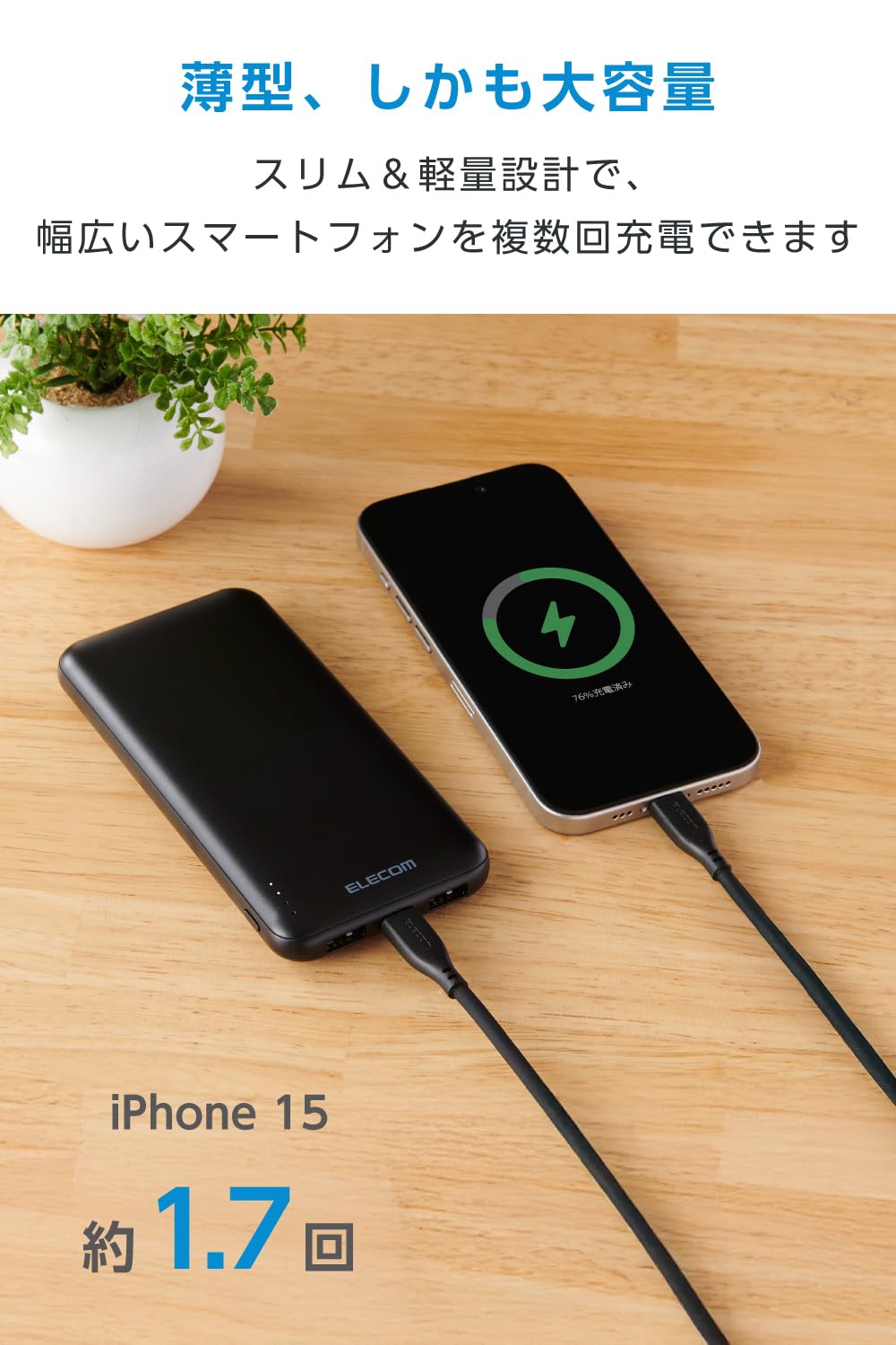 * たっぷり使える10000mAhで長時間の外出時も安心。持ち運びしやすい薄型形状のモバイルバッテリーです。