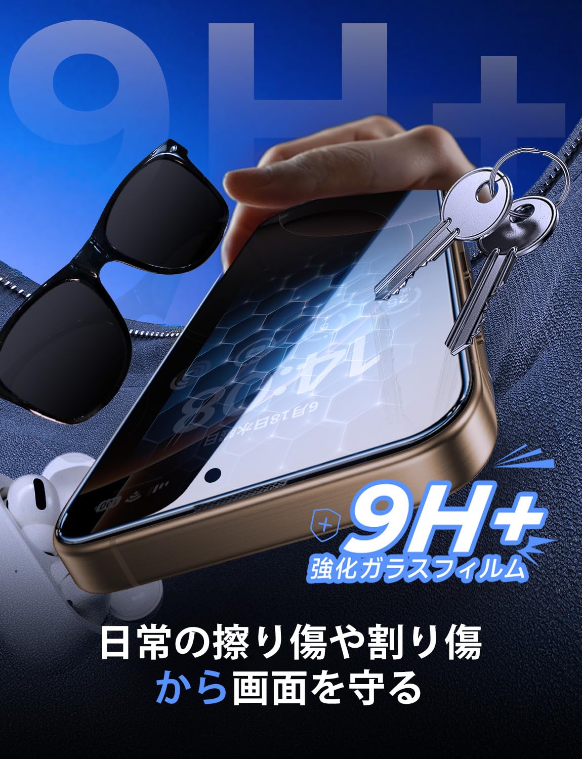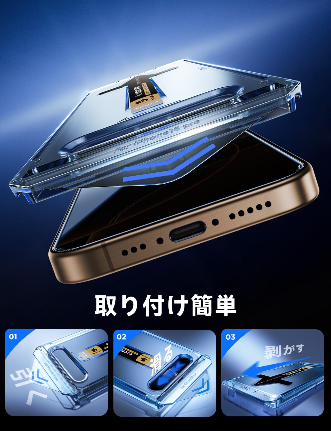 * 【もう失敗はしない】本製品はiPhone16proに対応するプライバシーフィルム2枚セットです。百万以上の欧米ユーザーのフィドバックを集めて日々改善したガイド枠は、3歩だけで保護フィルムを貼り付けます。そのうえ、自動ホコリ取りデザインだけでなく、ガイド枠のスロープデザインで、空気を順序に取り除くことができて、初心者でも気泡レスのまま綺麗に貼れます。