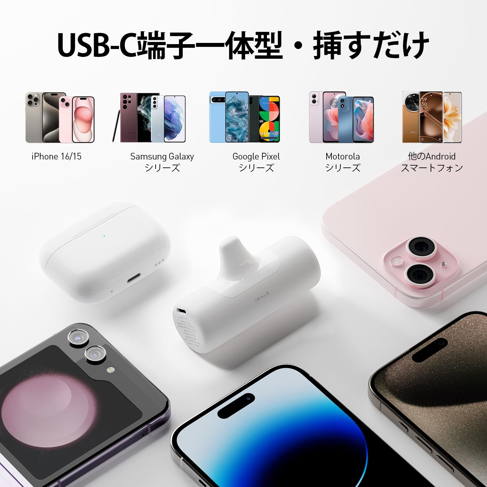 iWALK モバイルバッテリー 極小化 【USB-C端子一体型・iWALK 最小サイズ登場】 軽量 小型 4500mAh 急速充電 モバイル バッテリー タイプc アイウォーク type c コネクター内蔵 コードレス パススルー機能 残量インジケーター付き 可愛い 持ち運び便利 iPhone/AirPods/Android対応 「iPhone 17/16/15シリーズ対応」PSE認証済 ホワイト