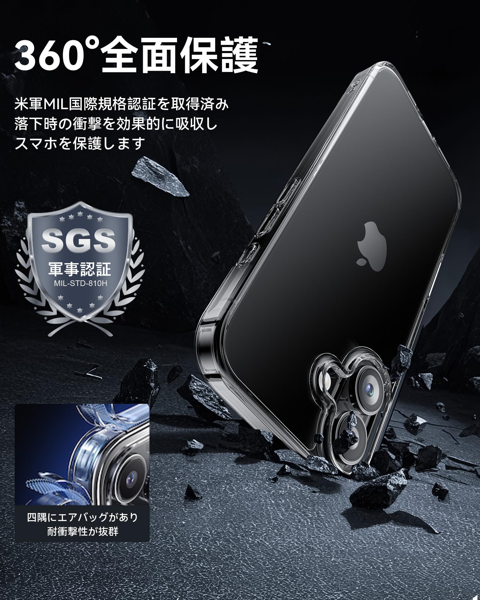 * 【米軍規格SGS認証・超強耐衝撃性】世界で有名な米国防総省が規定する米軍採用品規格「MIL-STD-810H」認証を取得済みです(認証番号:GZMR220802496801)。コンクリートの地面に厚さ5mmの合板を敷き、高さ1.2mから合計26回、違う角度から落下させる実験をしましたが、本体に傷はつきませんでした。四隅には高耐震クッションを搭載しており、高い耐衝撃性です。スマホを全方位からしっかりと守ります。