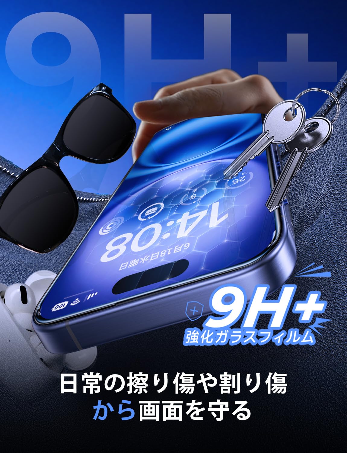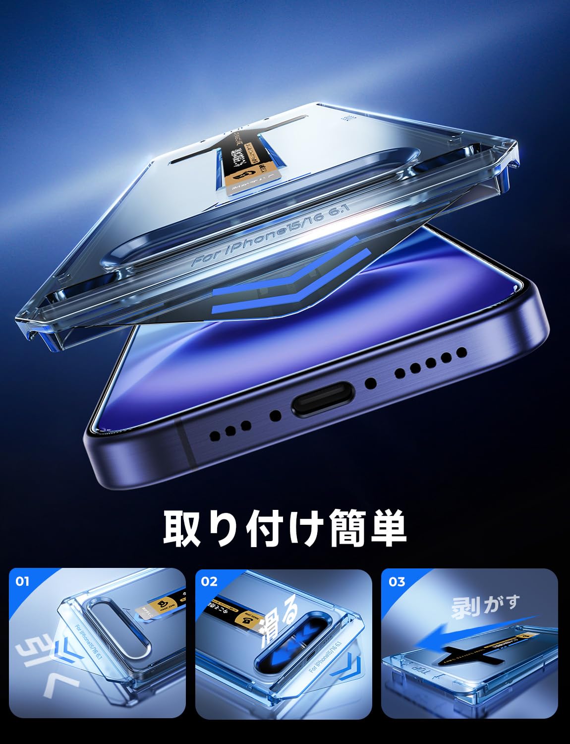 * 【もう失敗はしない】本製品はiPhone16に対応するガラスフィルム2枚セットです。百万以上の欧米ユーザーのフィドバックを集めて日々改善したガイド枠は、3歩だけで保護フィルムを貼り付けます。そのうえ、自動ホコリ取りデザインだけでなく、ガイド枠のスロープデザインで、空気を順序に取り除くことができて、初心者でも気泡レスのまま綺麗に貼れます。