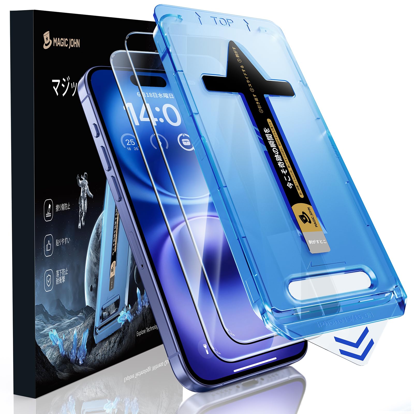 「光沢」 MAGIC JOHN 対応 iPhone 16 ガラスフィルム 2枚セット ガイド枠一体式 貼りやすい ズレなく 気泡レス 高透過率 触り心地良い 黒縁あり