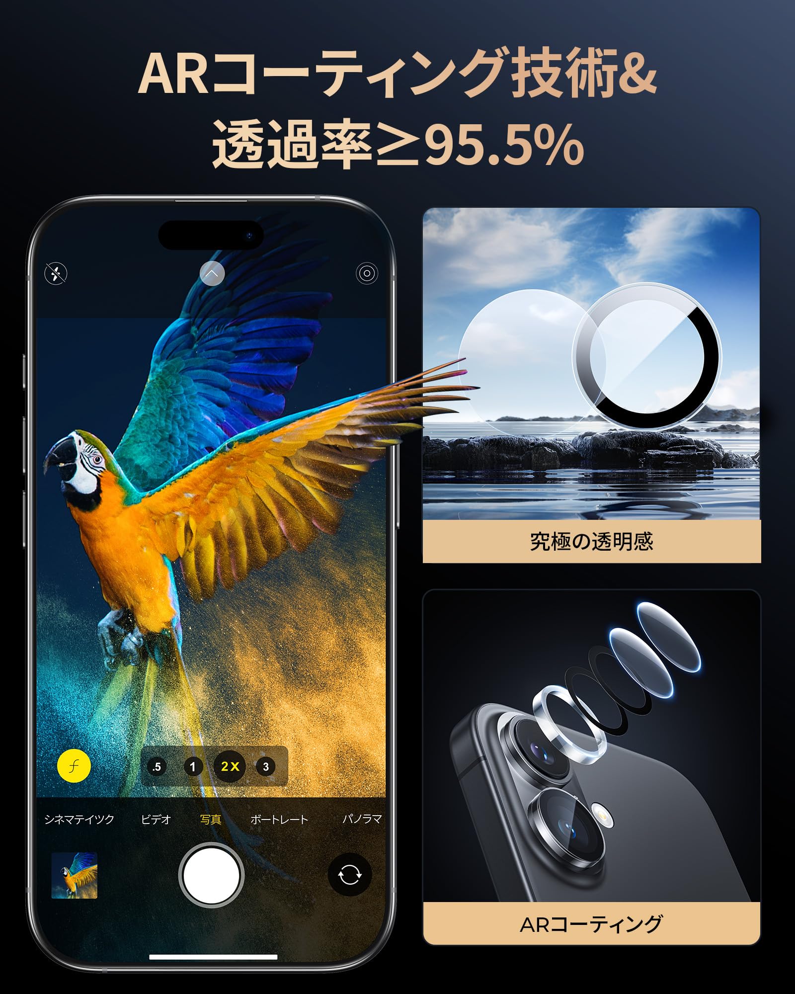 * 「ARコーティング・超高透過率」最先端のAR(Anti-Reflection)コーティング技術により、高透過率を達成しました。iPhone本来の撮影画質を損なわず、フレアやゴースト、反射を減らし、夜間の撮影も非常にクリアです。革新的な製造技術を融合した高い品質で、アイホン17/16/16プラスカメラ本来の高画質と優れた描写性能を十分に生かす商品です。