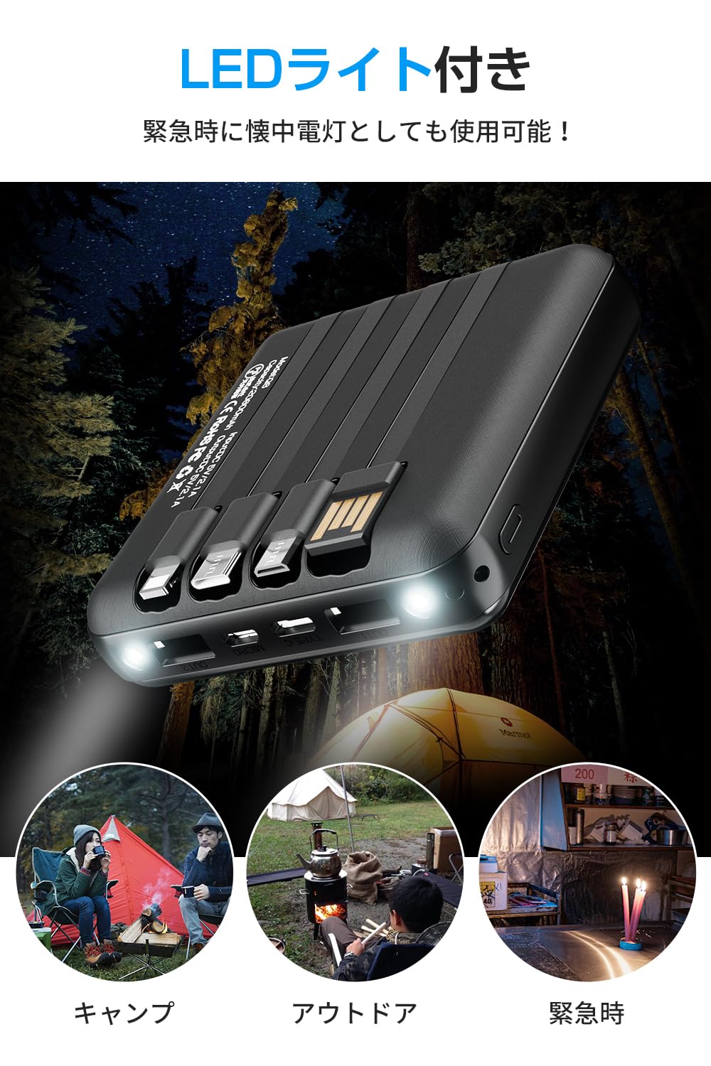 * 【6台同時充電可能 &4本ケーブル内蔵&ワイヤレス充電】出力にはUSB-A ×2ポートと3規格のケーブル内蔵とワイヤレスで6台同時に充電可能です。入力にも充電ケーブル内蔵と蓄電用microポートと蓄電用Type-Cポートの3つ選択肢があり、お持ち運びが便利になります。出力にはmicroUSB、USB type-Cなど3規格出力ケーブルが内蔵された最新型のケーブル内蔵モバイルバッテリーです。専用ケーブルを持ち歩く必要がなく、各種タイプのデバイスにも対応出来ます。更に、モバイルバッテリーの本体に充電ケーブルが内蔵されているため、コンセントのある場所であれば即時充電が可能。