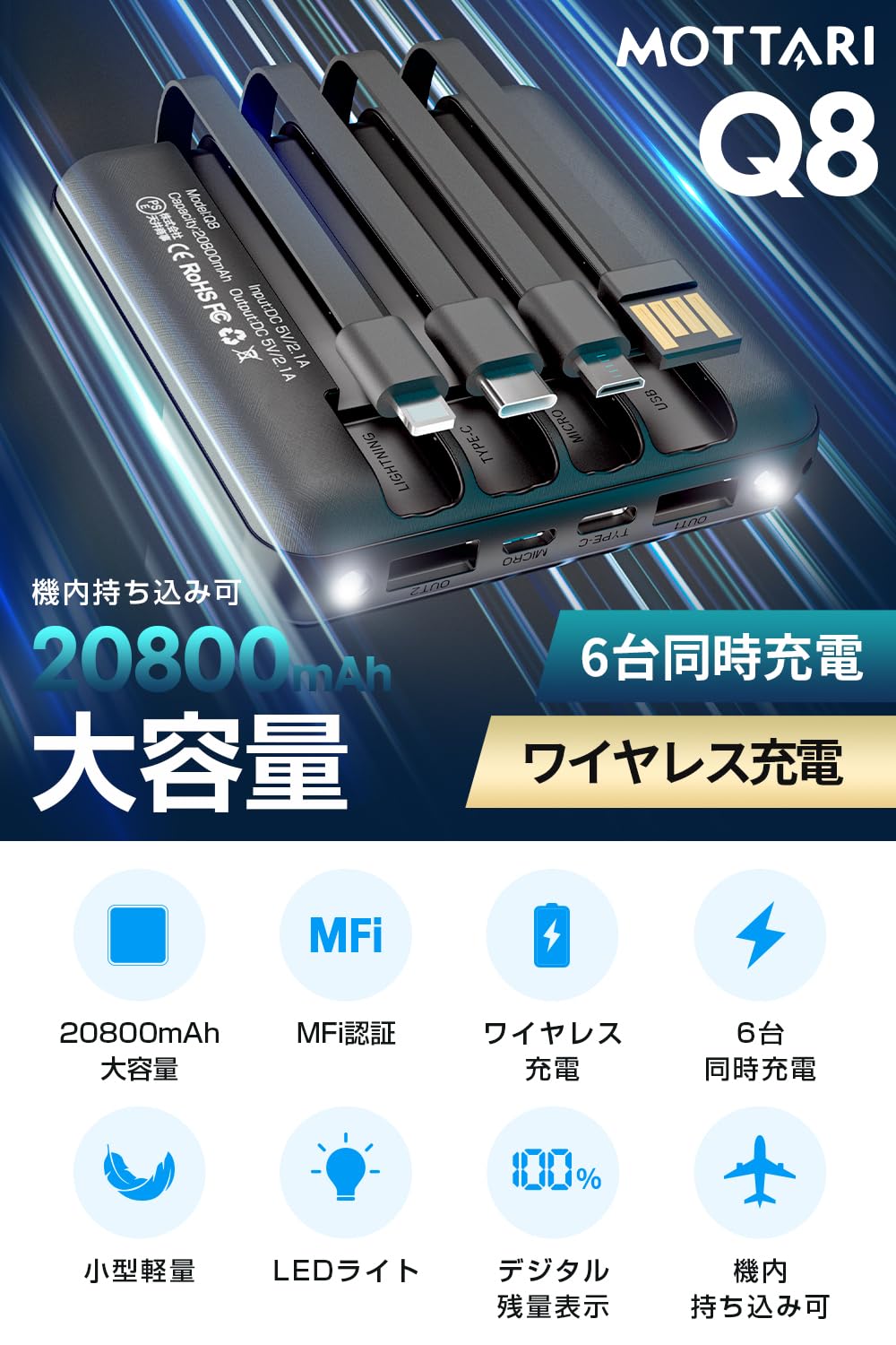 モバイルバッテリー 軽量 大容量 20800mAh【 MFi認証& 4ケーブル内蔵】 ワイヤレス充電対応 3Way蓄電 急速充電 携帯充電器 6台同時充電 Type-C コンパクト LED残量表示 回路保護 機内持ち込み可能 PSE認証済 旅行/出張/アウトドア/防災/地震/停電対策などの必携品 iPhone/iPad/Android各種スマホ対応