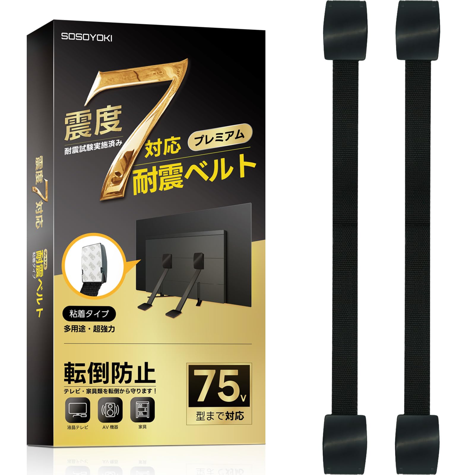 SOSOYOKI 耐震ベルト テレビ用 耐震度7 転倒防止 液晶モニター 地震対策 工具不要 ラクラク設置 落下防止 長さ調整可能 75インチまで 2本セット (粘着タイプ)