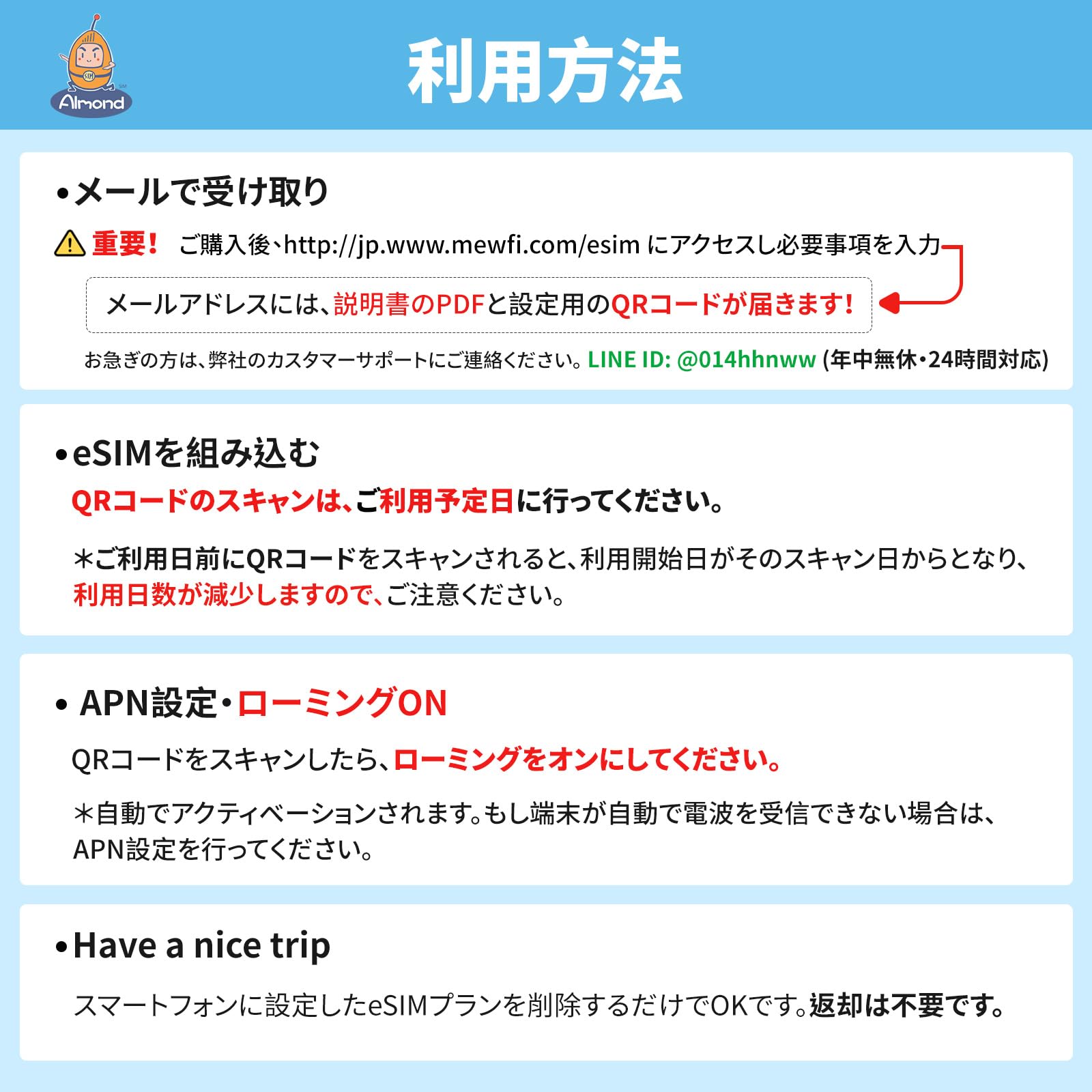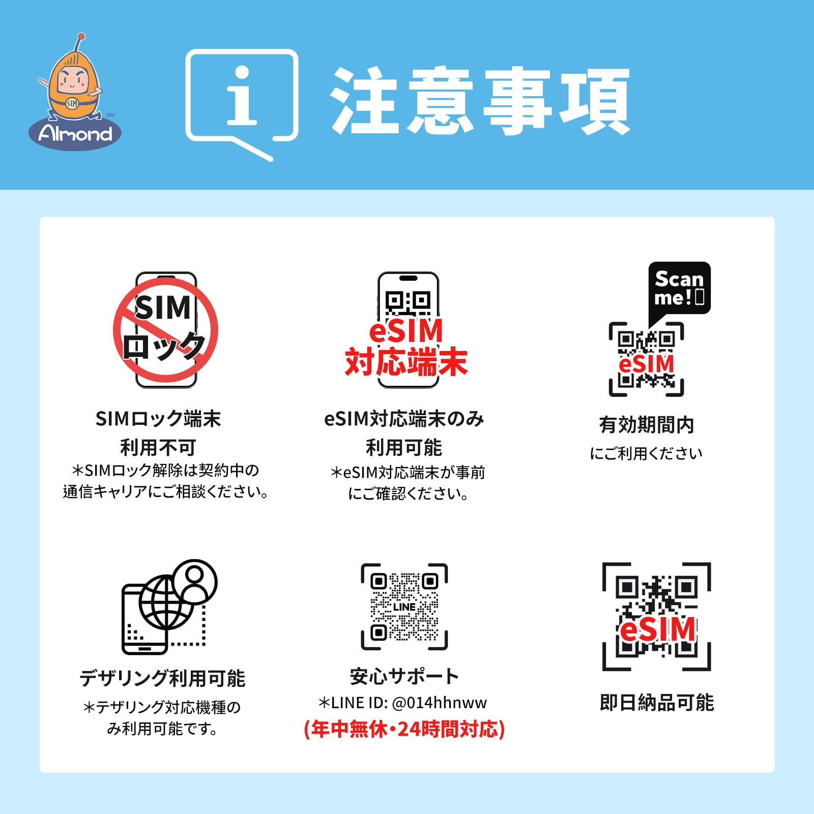 * 【ご確認ください】ご注文いただいた後、通常は注文日を含む1営業日以内に、https://jp.www.almondsim.com/esim にて注文番号とメールアドレスを入力していただくことで、eSIM(QRコード)および設定方法をメールでお送りします。お急ぎの場合は、お支払い完了後に弊社の24時間対応カスタマーサポート(LINE ID: @014hhnww)までご連絡ください。すぐにQRコードを発行いたします。