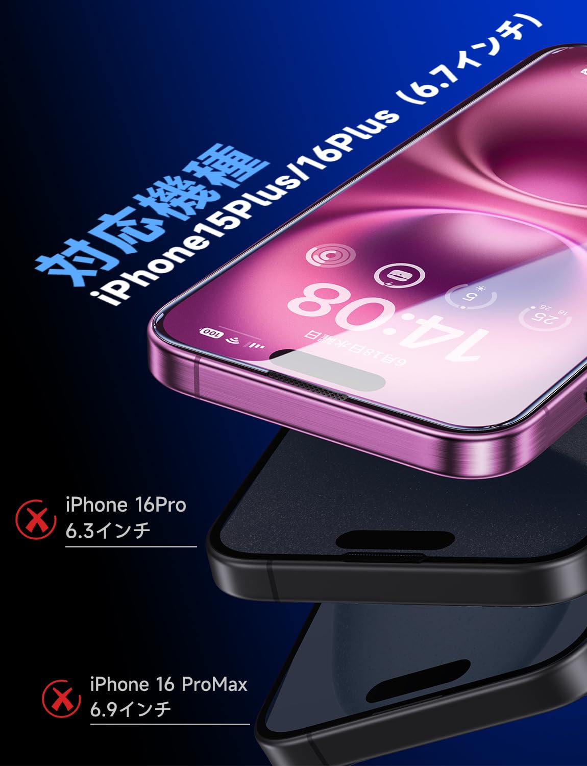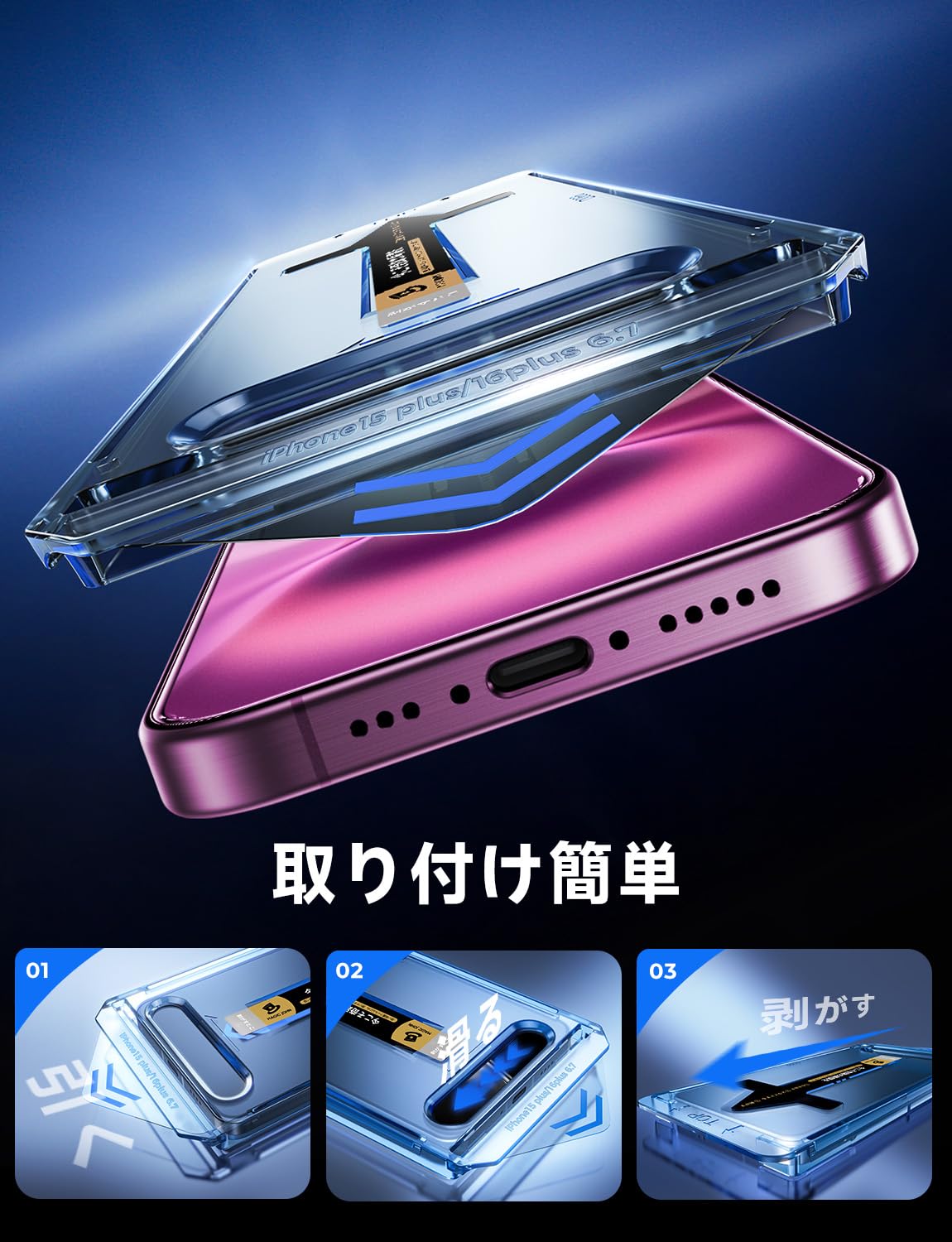 * 【もう失敗はしない】本製品はiPhone 16 Plus/15 Plusに対応するガラスフィルム2枚セットです。百万以上の欧米ユーザーのフィドバックを集めて日々改善したガイド枠は、3歩だけで保護フィルムを貼り付けます。そのうえ、自動ホコリ取りデザインだけでなく、ガイド枠のスロープデザインで、空気を順序に取り除くことができて、初心者でも気泡レスのまま綺麗に貼れます。