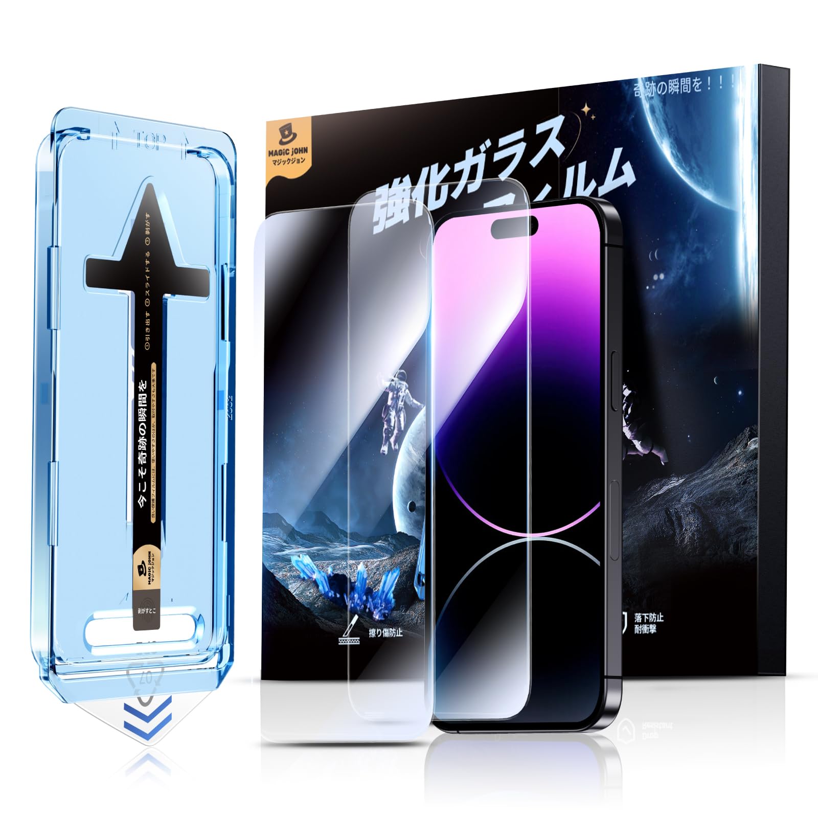 【光沢】MAGIC JOHN 対応 iPhone 14 Pro Max 用 ガラスフィルム 2枚セット ガイド枠一体化 貼りやすい 気泡レス 高透過率 触り心地良い