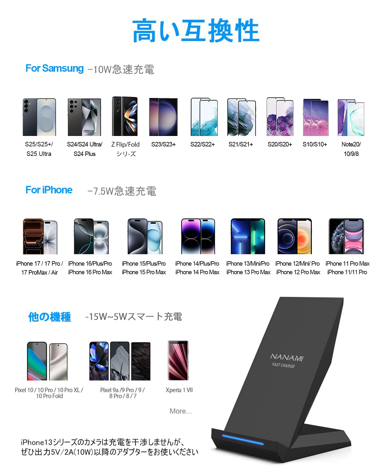 NANAMI ワイヤレス充電器 Qi認証 iPhone 17/16/15/14/13/12/11/SE/8シリーズ Galaxy S25/S24/S23/S22/21(Ultra) 他のqi機種対応 USB Type-C端子 Quick Charge 3.0 最大15W出力 急速 置くだけ充電 スマホスタンド ワイヤレスチャージャー 日本語取扱説明書付属 お正月 春のギフト ブラック