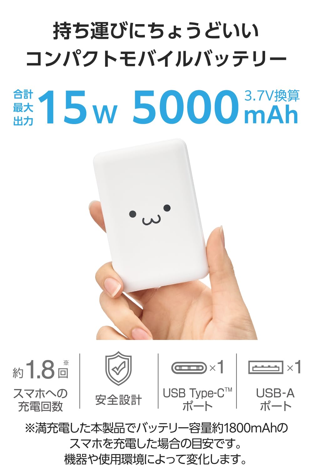エレコム モバイルバッテリー 15W 5000mAh 軽量 小型 薄型 5V 3A Type-C USB-A ケーブル別売り 【 iPhone15 / SE3 など対応】 しろちゃん(ホワイト×ブラック) EC-C12WF