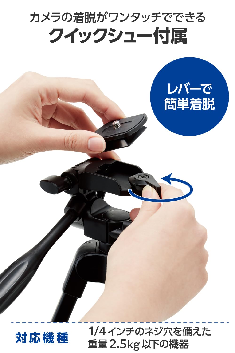 * さまざまな一眼レフカメラ、ビデオカメラなどに対応している1/4インチネジを採用しています。 ※耐荷重:約2.5kg