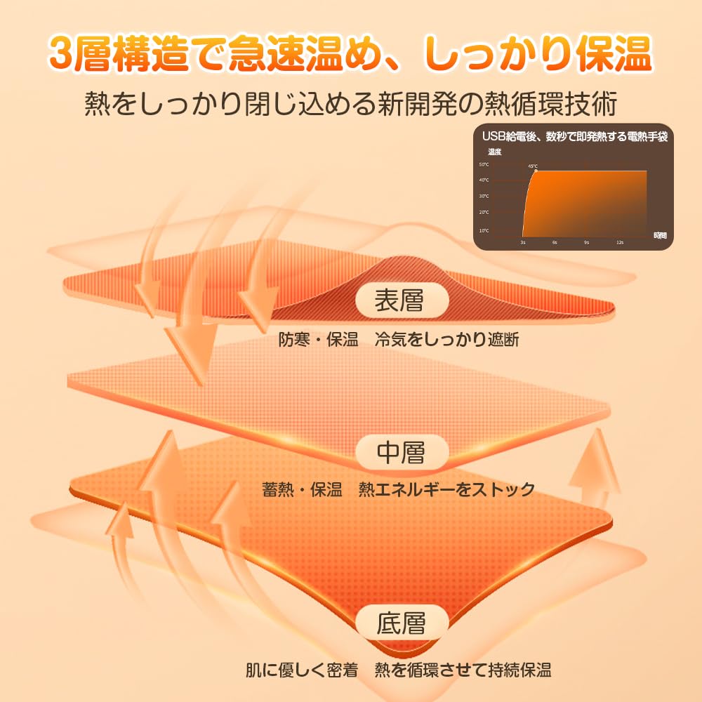 手のひら・手の甲・指先までしっかり暖かく、3層構造で素早く保温し、熱を逃しません。