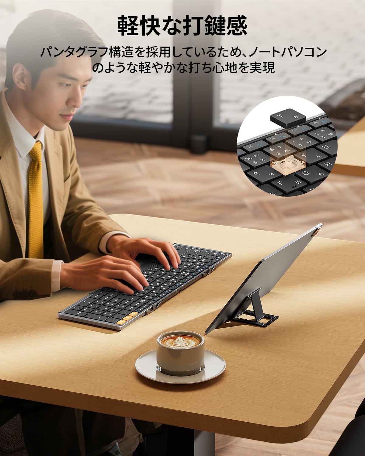 ■ 【ノートパソコンのような打ち心地】ノートパソコンと同じパンタグラフ構造とキーサイズを採用しているため、あらゆる場所でノートPCのような軽快な打鍵感を実現しています。