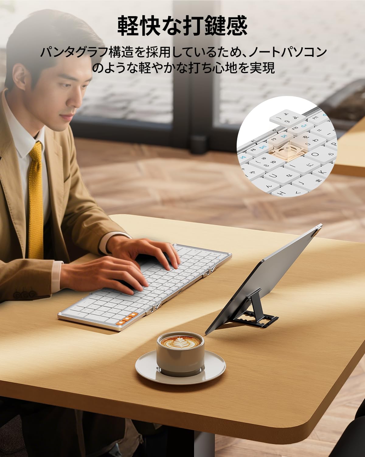 ■ 【ノートパソコンのような打ち心地】ノートパソコンと同じパンタグラフ構造とキーサイズを採用しているため、あらゆる場所でノートPCのような軽快な打鍵感を実現しています。