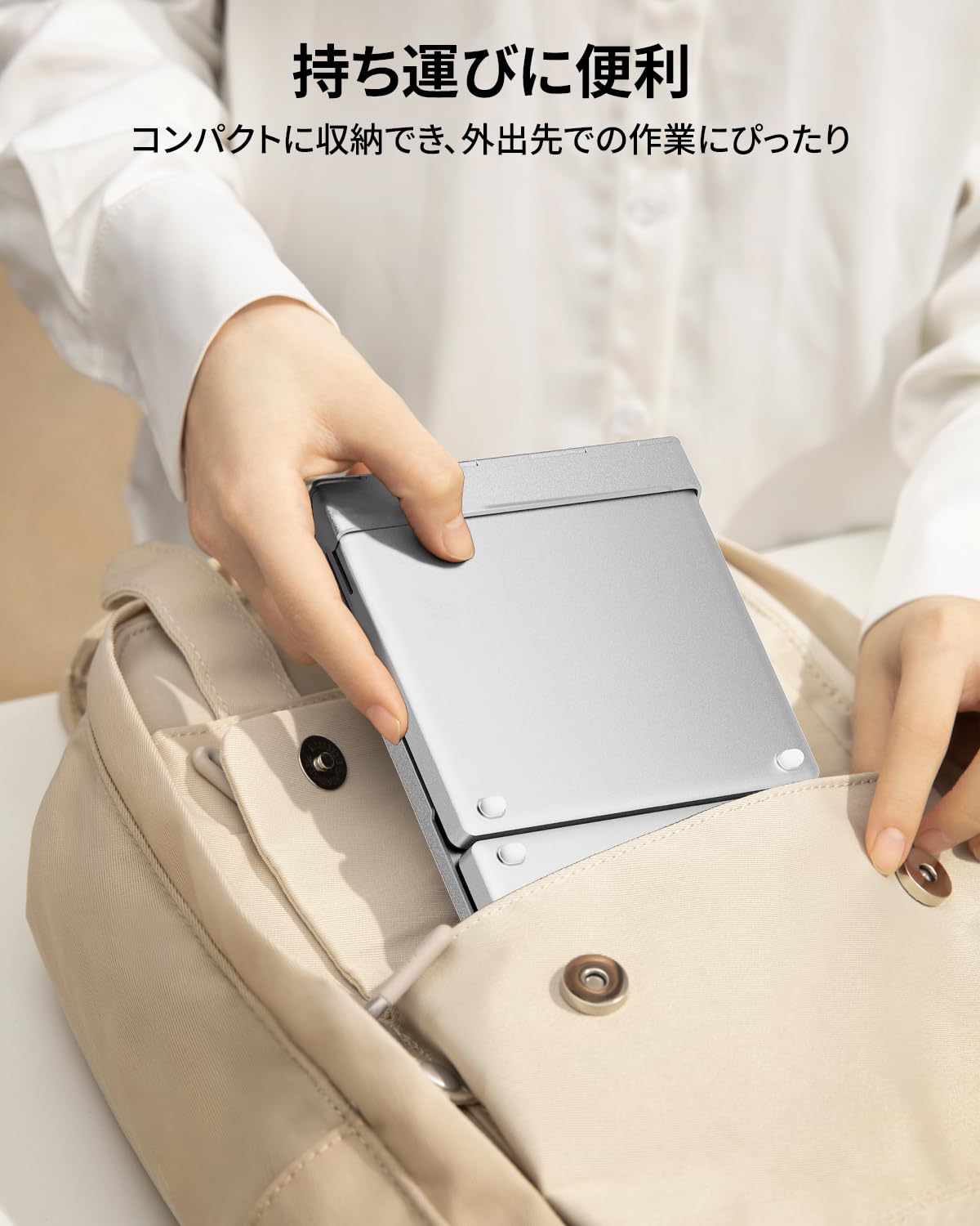 三つ折り構造で折りたたむとiPad miniと同じくらいサイズになり、重さも291gと軽量で、外出や出張などの際の持ち運びに便利です。