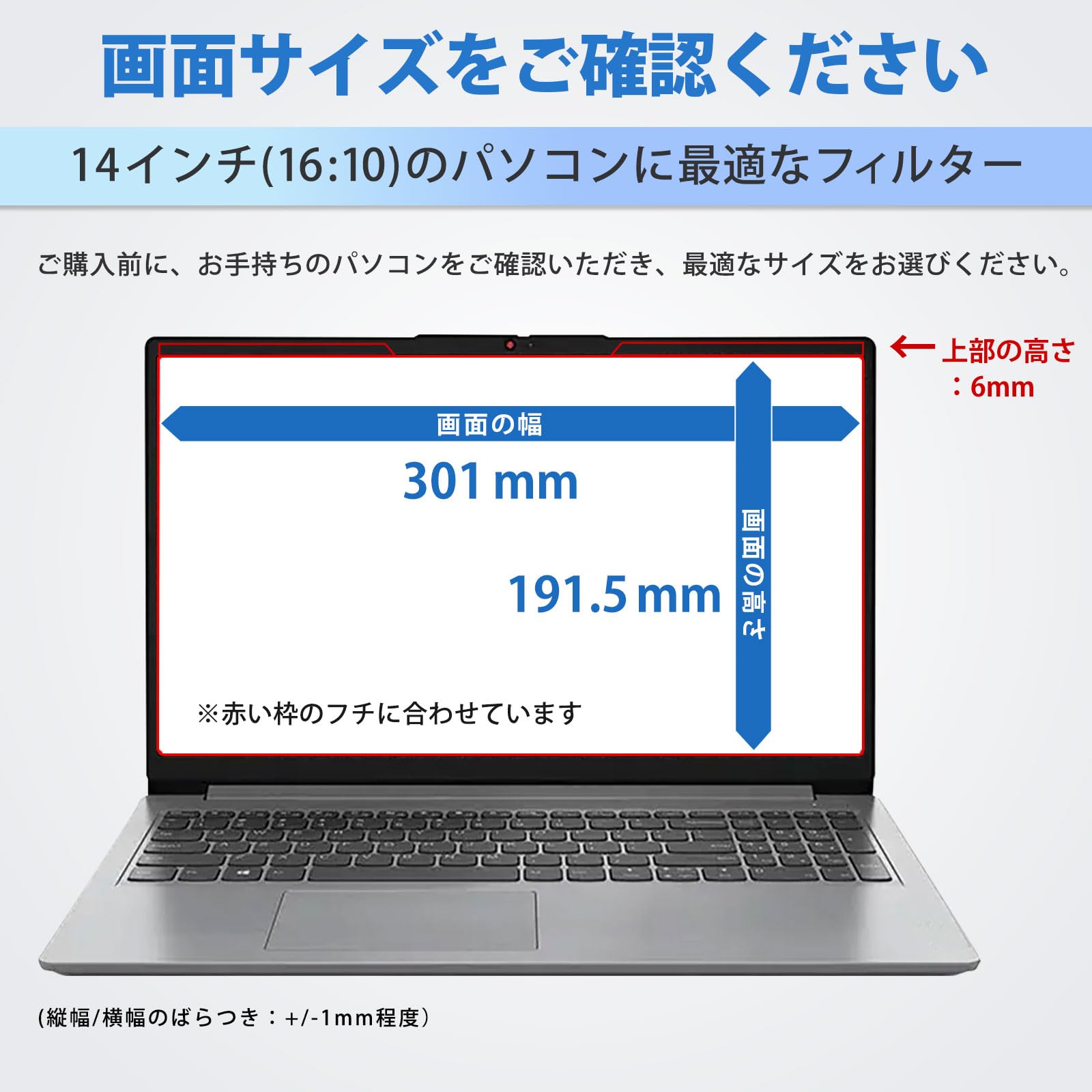 ■ 対応サイズ: 14インチ 16:10 寸法:フィルター部分のみ301mm x 191.5mm(縦幅/横幅のばらつき ±1mm)。