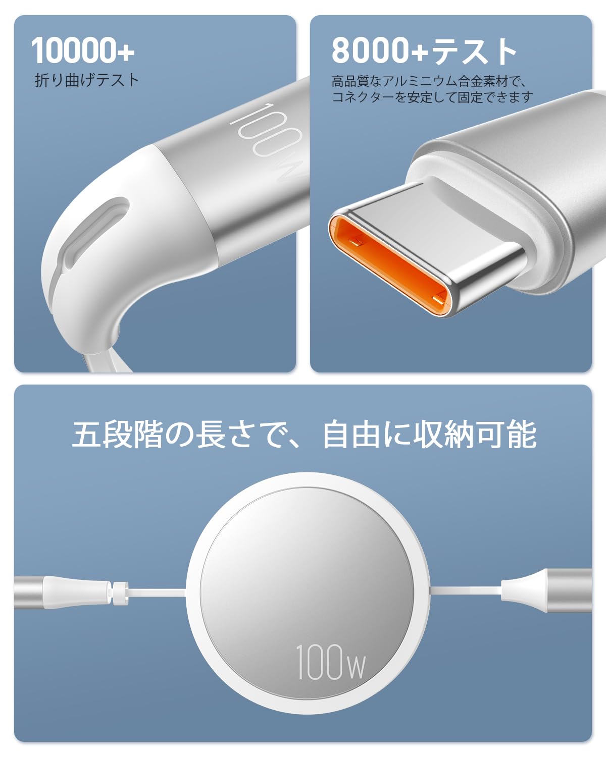 ■ 【3in2巻き取り式充電ケーブル&最大100W充電対応)】本製品は、100W対応のUSB-C巻き取り式充電ケーブルです。