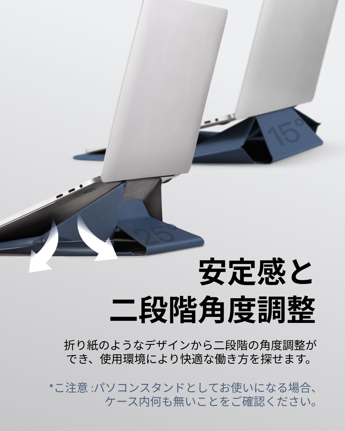 わずか7mmの薄さながら、15°と25°という2段階の角度調整が可能です。