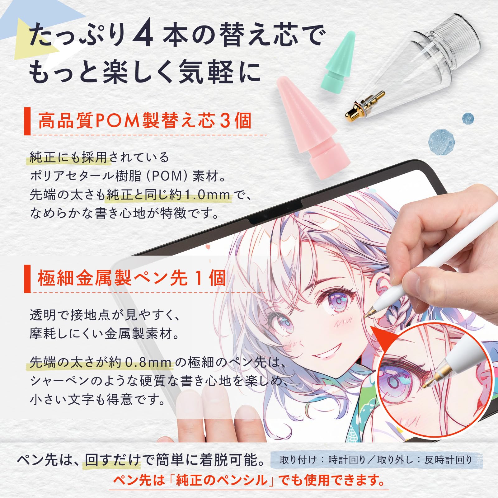 ▶▶▶【スラスラかける君 セット内容】:iPad専用 スタイラスペン × 1本、交換用ペン先×4個(樹脂製(POM)×3個 / 金属製×1個)、充電用USB type-Cケーブル×1本、取扱説明書。