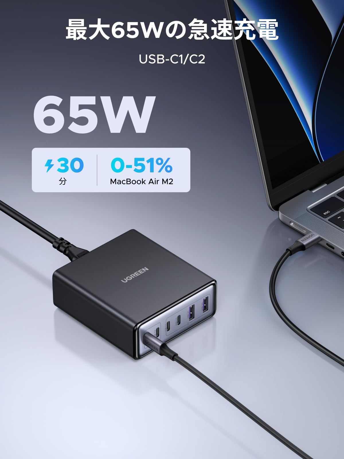 ■ 【単口最大65W & 総出力100W】Type-C単口使用時は最大65Wの高出力で、ほとんどのノートPCを素早く充電。