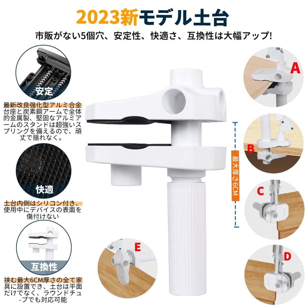 ■ 【耐荷重2KG&超安定&充電穴付き】2023年最新改良强化型アルミ合金台座と炭素鋼アームで全体的金属製、堅固なアルミアームのスタンドは超強いスプリングを備えるので、頑丈で揺れなく、安定性が抜群です。