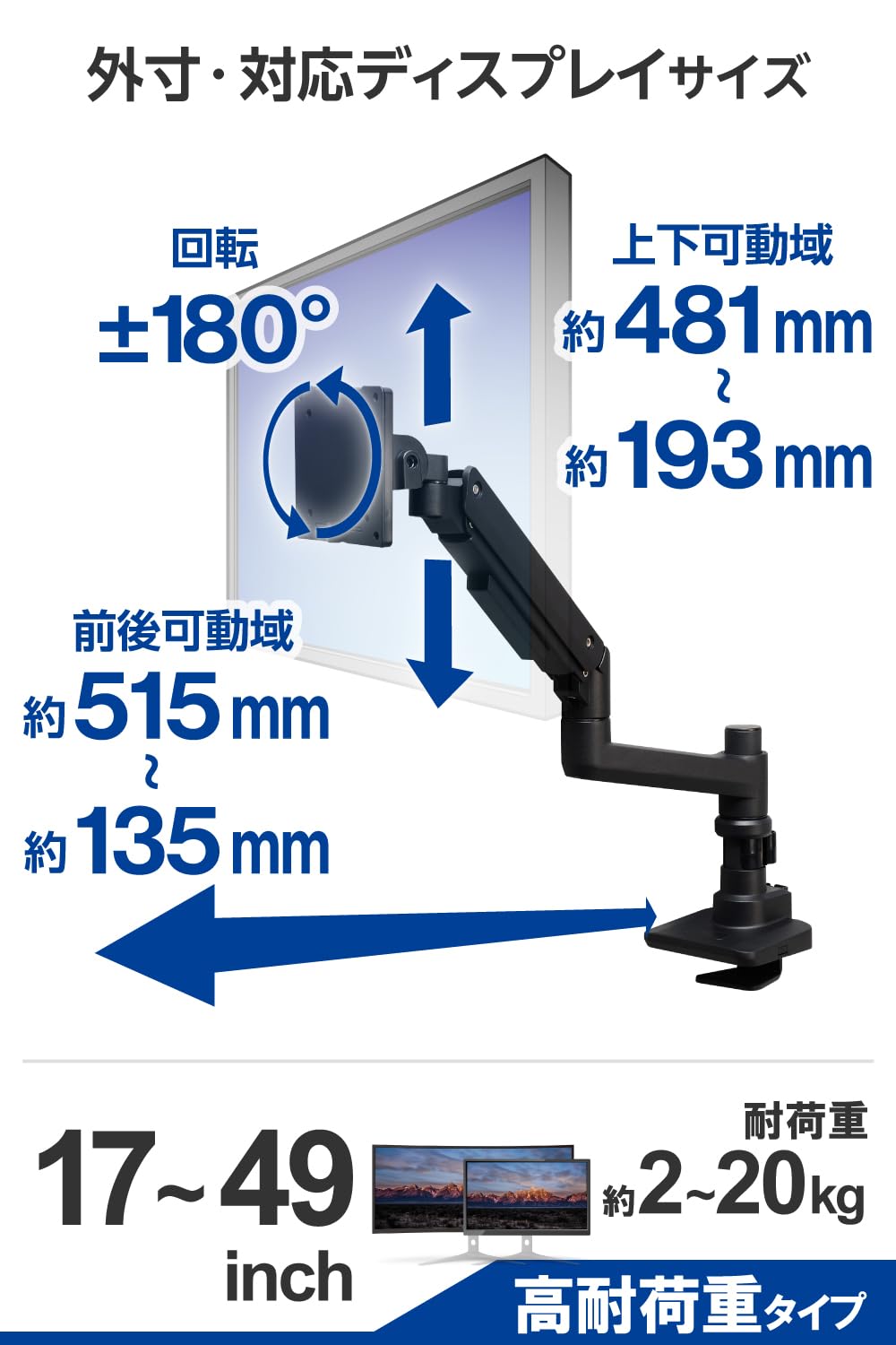 ■ 17~49インチサイズのモニターに対応する高耐荷重ガススプリング式のポールマウントタイプ シングルモニターアームです。