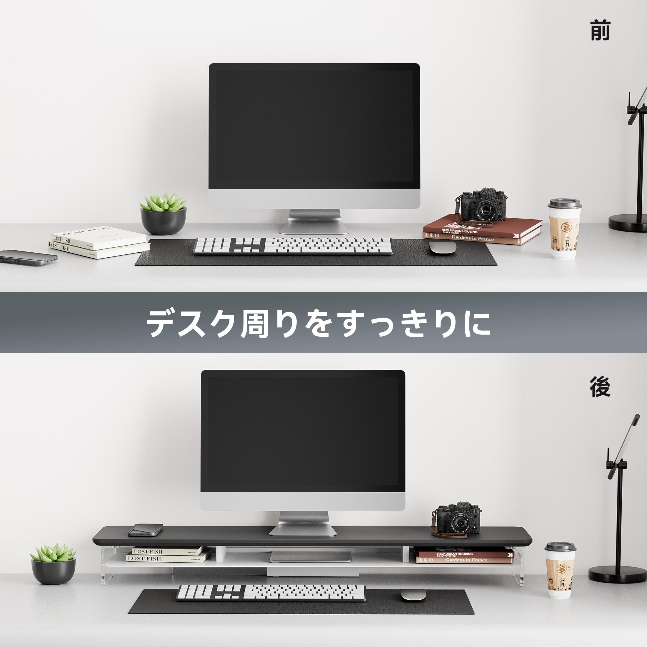 ■ 【アクリルの脚・浮いている空間】モニタースタンドの脚は、透明なアクリル板を採用しており、解放感があります。