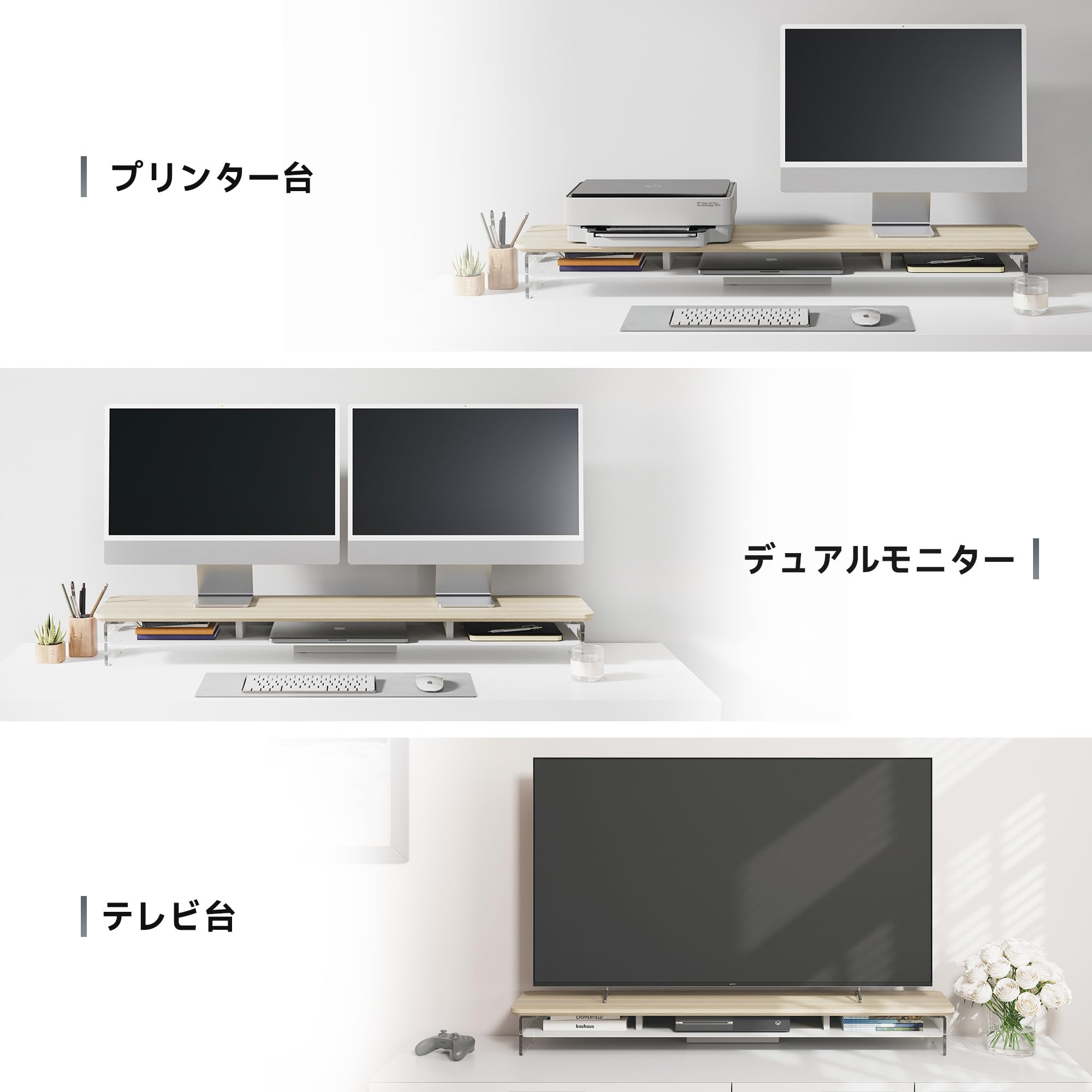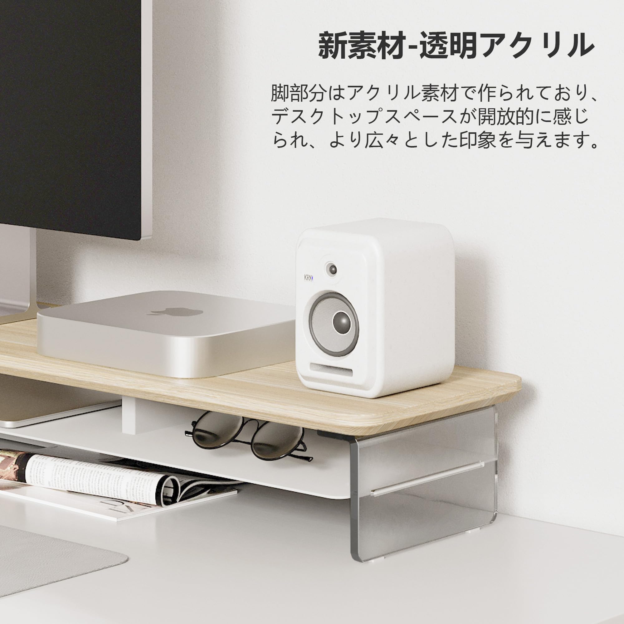 ■ 【アクリルの脚・浮いている空間】モニタースタンドの脚は、透明なアクリル板を採用しており、解放感があります。